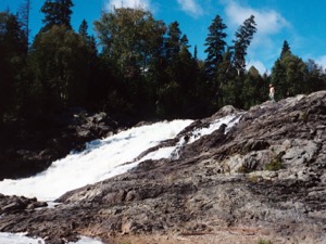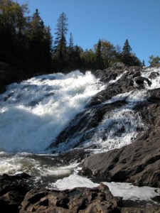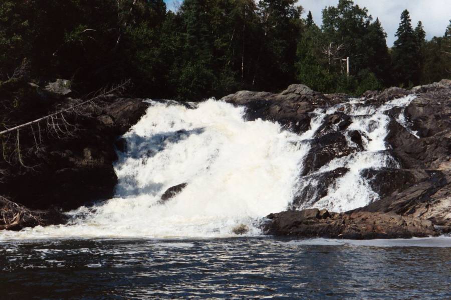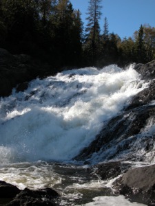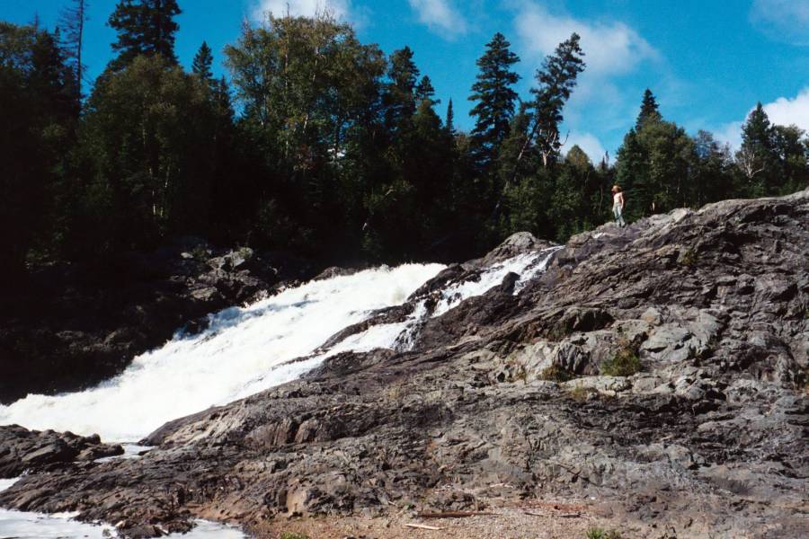 Silver Falls is a series of three falls. The Falls are a few miles south of Wawa. Just past the parking area, or the end of trail from High Falls, there is a bridge that crosses the river. From there you get a nice distant view of the Middle Falls. The Lower Falls are just downstream of the bridge. You can climb down the rocks of the Lower Falls.