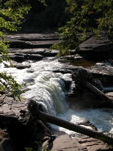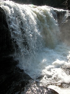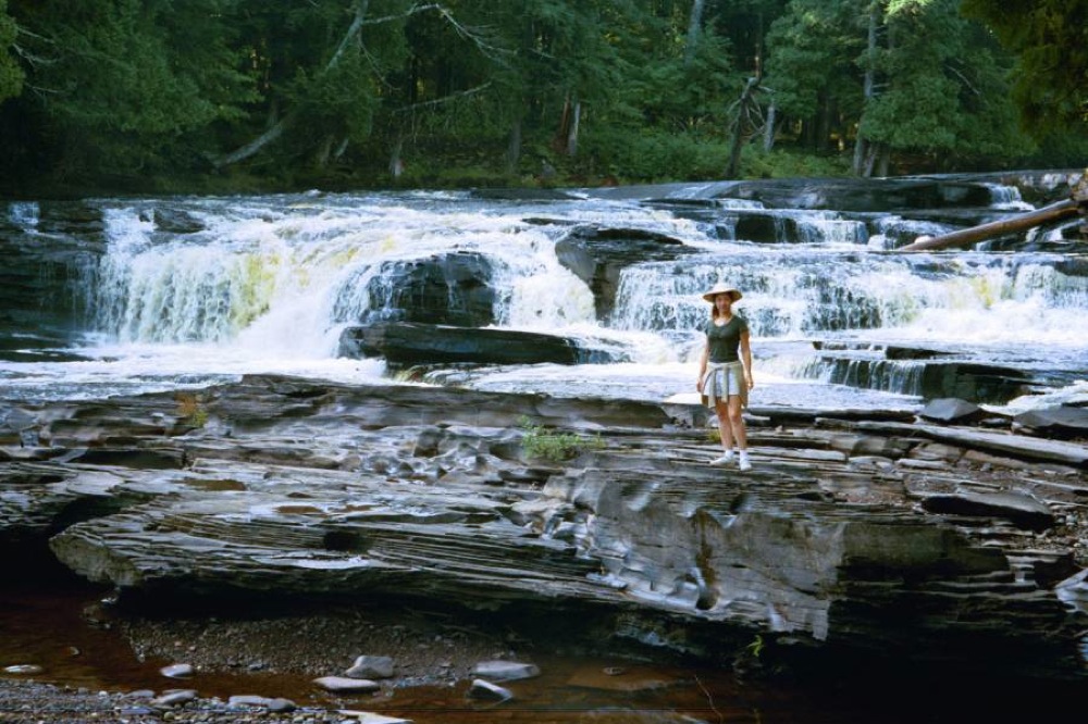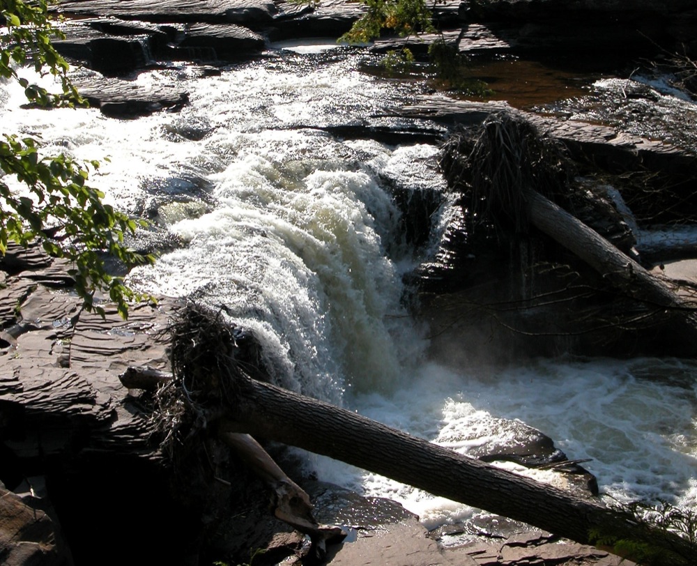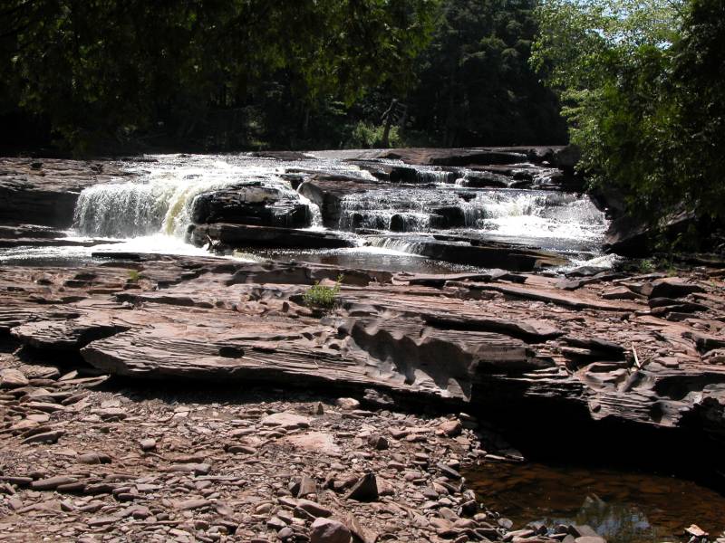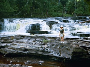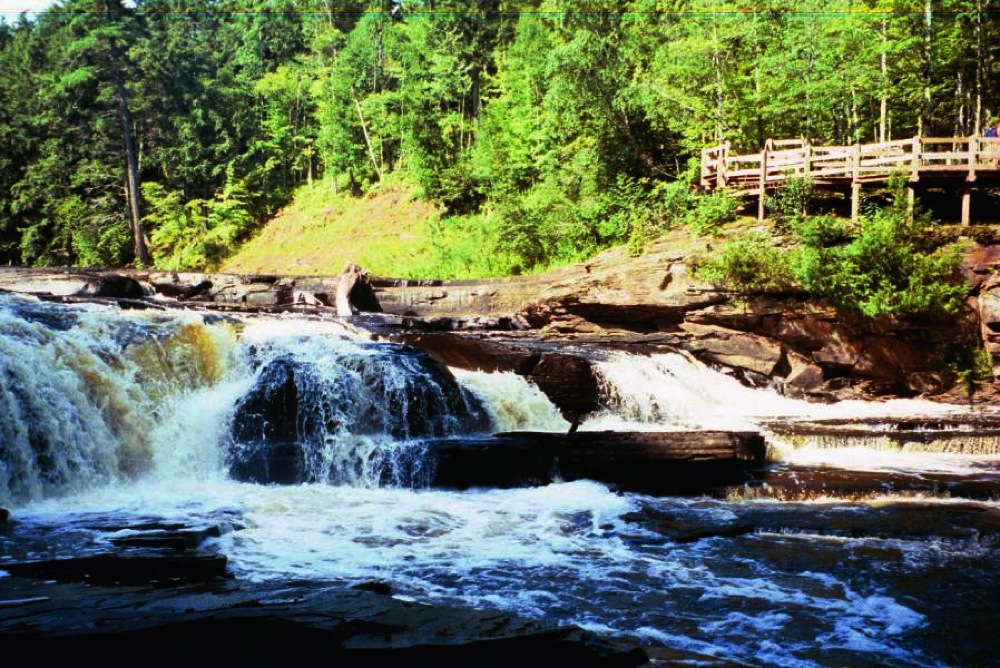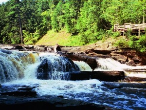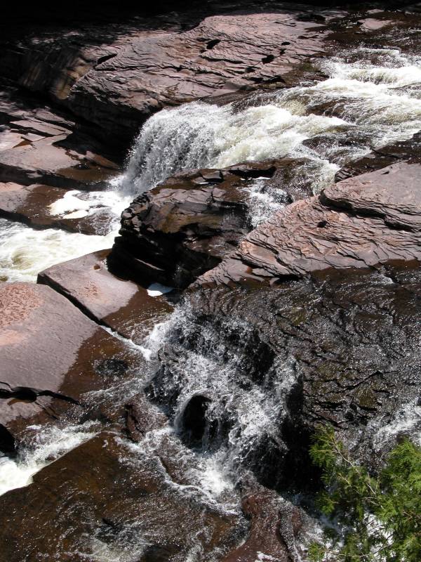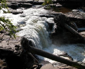 This is the smallest of the Presque Isle waterfalls. This waterfall is only 10 feet high. Its width can vary widely depending on how much water is flowing. In the spring it must easily be over 100 feet wide. This waterfall is just above Manabezho Falls. There is a set of stairs that leads to an overlook just above the falls on the west side of the river. On the wilder east side you can get down to the rocks above and below the falls.