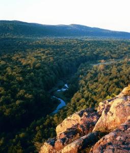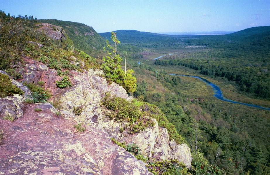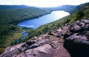 Michigan's Porcupine Mountains is one of the largest state parks in all the midwest. Located on the western edge of the U.P, the park contains nearly 60,000 acres of virgin forest on the shores of Lake Superior. The "mountains" stopped growing a long time ago and millions of years of erosion have worn them down. The highest point in the park is only 1300 feet above lake level. But the area is by no means flat, and as a result the park features a number of waterfalls. The largest and easiest to visit are the waterfalls on the Presque Isle River on the western edge of the park. Manabezho Falls is the most impressive of these. These falls are all just a relatively short walk from your car.