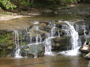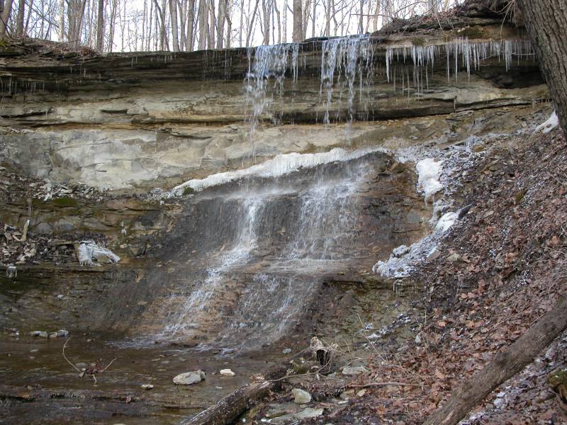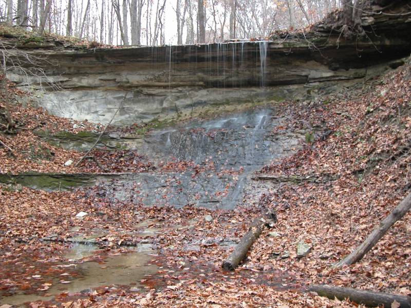 This 20'? waterfall is on the lands of the former Camp Kokiwanee Girl Scout Camp. The land was recently purchased by ACRES and is now open to the public as the Kokiwanee Nature Preserve. The falls is just outside of Lagro Indiana. From US 24 take Hwy 524 south into Lagro. Follow it across the Wabash. Take a right onto Hanging Rock Rd. Follow this until you reach Country Road 300 E. Follow this for a short distance. The park is on the right. A short distance from the parking area a sign directs you along a long, rambling and not always well defined trail that eventually leads to the falls. It is about a 30 minute walk. You can also follow the main trail, an old road, and after about 30 minutes a sign will direct you towards the waterfall. If you are feeling lazy, you can actually drive to within viewing distance of the falls. Just continue on County Road 300 E. Take a right at the stop sign, and then take the next right into the Tailwater Fishing area. There is a parking lot, and the falls will be on the right.
