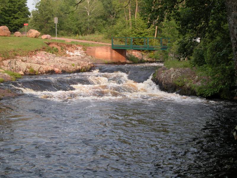 Kimball Falls is in Kimball Wisconsin. While driving west along US 2 from Saxon Falls to Peterson Falls you will see a small sign on the south side of the road for Kimball Falls. Kimball Falls is a small rapids in a small park. It is less than a mile from US 2 and easy to get there, so visiting it will not take much time, and it would be a nice area to stop for a lunch break. The sign for Peterson Falls is the same style as the sign for Kimball Falls, but Peterson Falls is far more impressive.