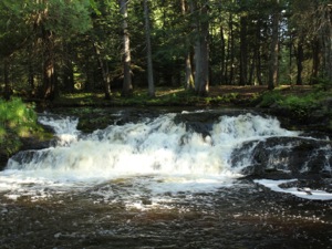 Kakbika Falls is a series of falls on the Cisco Branch of the Ontonagon River. This is a complicated waterfall. The river does an S curve with a number of cascades and drops. No drop is particularly high, and there is no vantage point from which you can see all the falls.