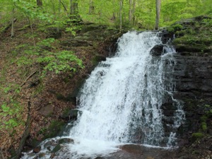 Laurel Falls is a seasonal falls in the Delaware Water Gap along side Old Mine Road. There are a number of drops on Sunfish Creek. The last one is about 15' high and is visible from the road. More drops are upstream, but I did not go exploring and see them personally. I was fortunate and saw the falls on a warm sunny day after a good rain. The falls are located across from the Douglas Trailhead parking lot. A is 15 miles to the east on Old Mine Road. There are a number of other seasonal falls between the two. A couple of them were quite impressive.