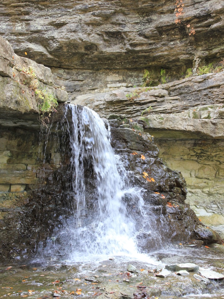 McCormick's Creek Falls is a 10' drop located in McCormick's Creek State Park. This is Indiana's oldest state park. The focal point of the park is the falls and the impressive canyon that McCormick's Creek has carved out. The canyon is a mile long, and more than 100 feet deep, which is quite significant for the otherwise relatively flat Indiana landscape. The creek drops over 150 feet on its way through the park, but the falls is the only drop of any significant height.