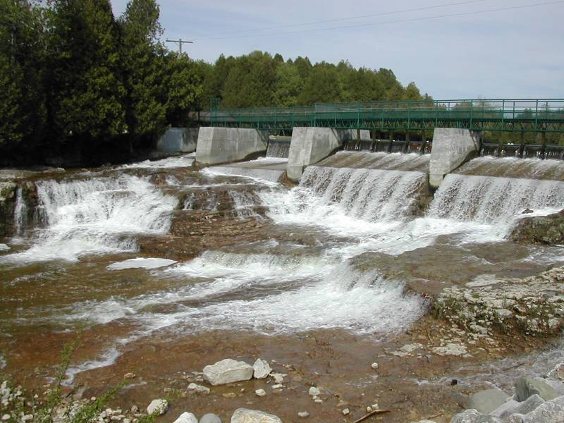 McGowan Falls is the smallest of the many falls in Ontario's Grey County. There is a dam on top of the falls, and the height of the falls is at most 10 feet. This is definitely not worth a long drive, but its worth a quick stop on your way to visit the many waterfalls in the Owen Sound area. The falls is located in a park just east of the Hwy 4/Hwy 6 junction. Inglis Falls is about 40km to the north. Eugenia Falls is about 30km to the east.