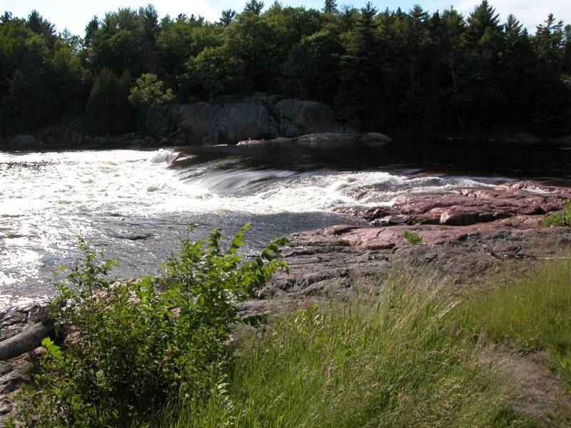 This waterfall shows up in MapQuest and is mentioned on canoe routes. The waterfall is about 5 feet high, but it is over 100 feet wide and a lot of water goes through this fall. It is visible from Hwy 17 just west of Blind River, Ontario. There is a short two track off of Hwy 17 that leads to the falls. Be careful because the two track is located right along a curve on Hwy 17. The Mississagi's much more impressive plunge is at Aubrey Falls far to the north.