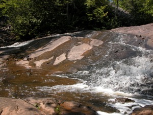 Nonesuch Falls is a small waterfall on the Little Iron River, located in the abandoned town of Nonesuch within the boundaries of Porcupine Mountains State Park. The falls is at most 10 feet high, and the river does not carry a lot of water in the summer. One interesting thing about the falls is that the bedrock is tilted at roughly a 45 degree angle, creating interesting obstacles for the river. Far more interesting than the falls is the remains of the old late 1800's mining town of Nonesuch. The crumbling ruins of a few old buildings can be found near the river and many subtler bits of evidence also remain.