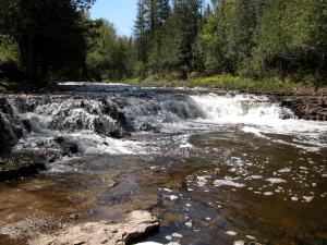 Also known as Burnt Dam Falls, this a low falls on the Middle Branch of the Ontonagon River. The river drops at most 10' in two distinct steps.