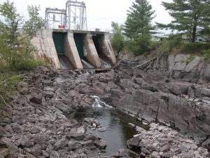 Mathiasville Falls was a small falls on the south branch of the Muskoka River. It has been all but obliterated by a dam. The water is mostly diverted. When I visited during a wet spell in May, only a trickle was flowing through the falls.