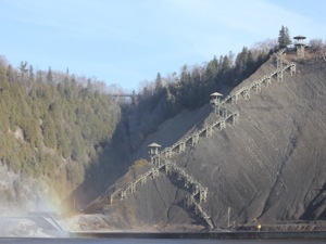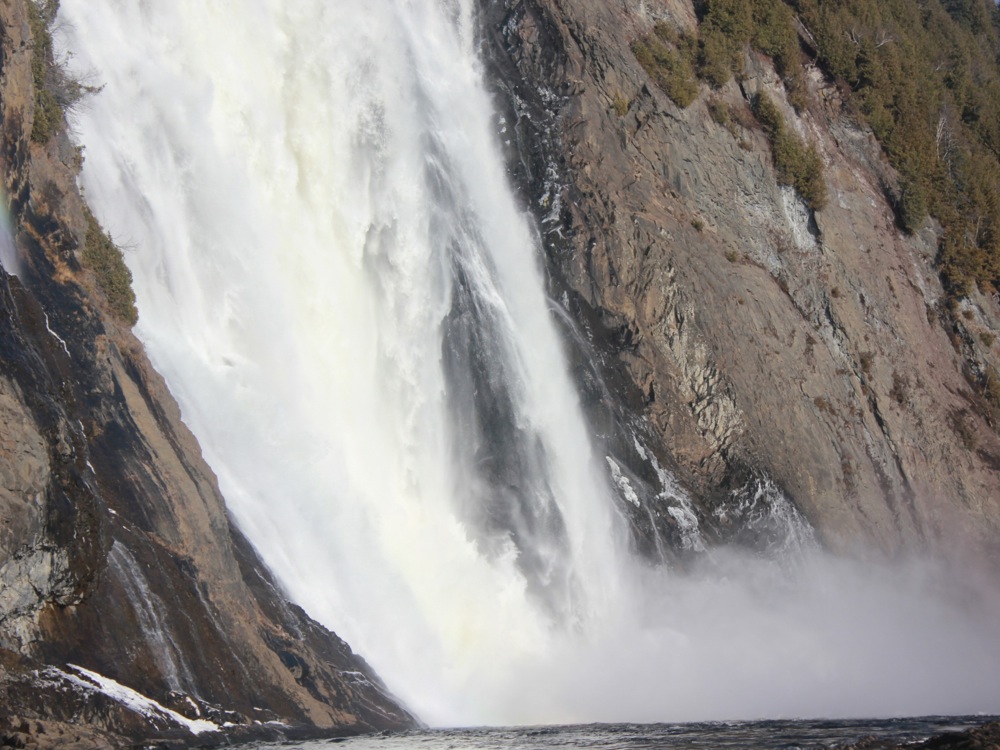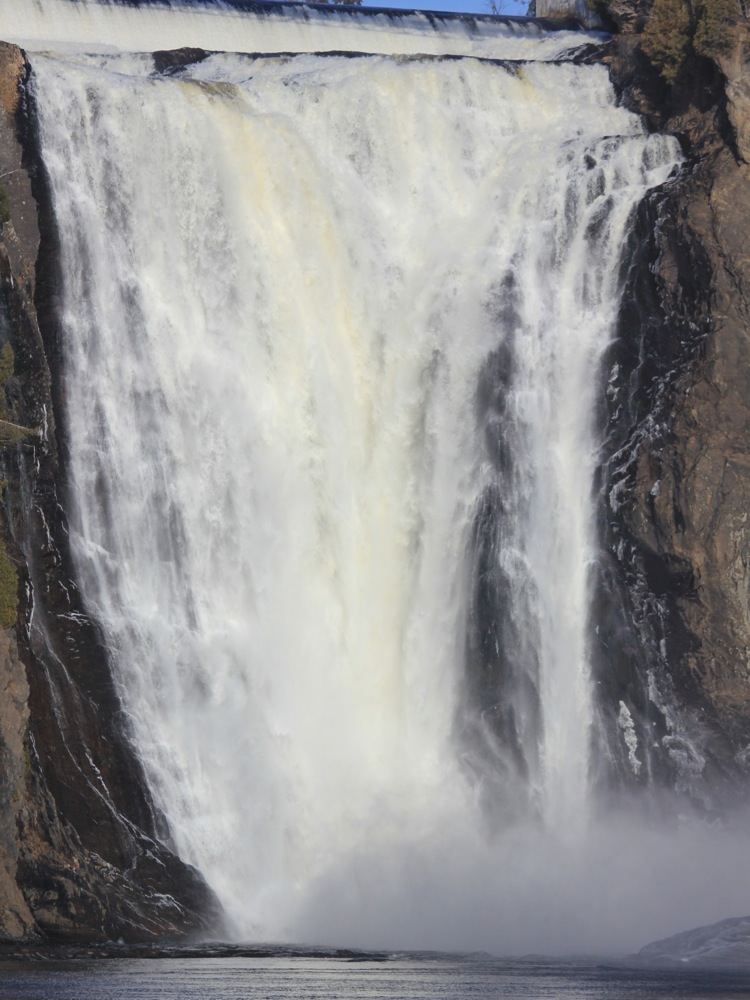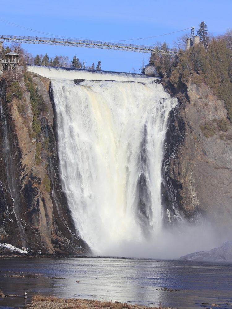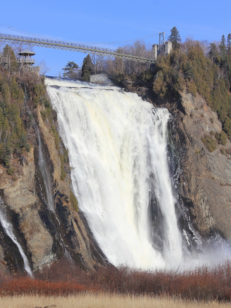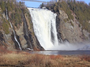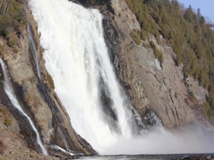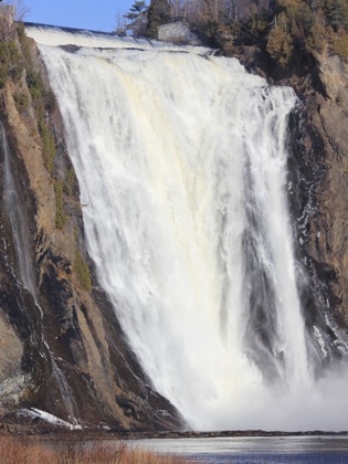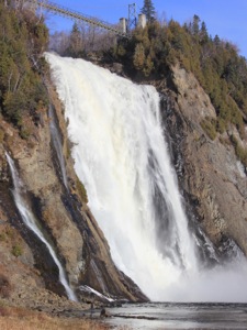 Montmorency Falls is a spectacular waterfall just east of Quebec City. Here the Montmorency River plunges down a steep cliff on its way to the St Lawerence River. At 84m high, and 30m wide, this is the largest waterfall in Quebec, a land of many spectacular waterfalls. It is also extremely easy to visit.