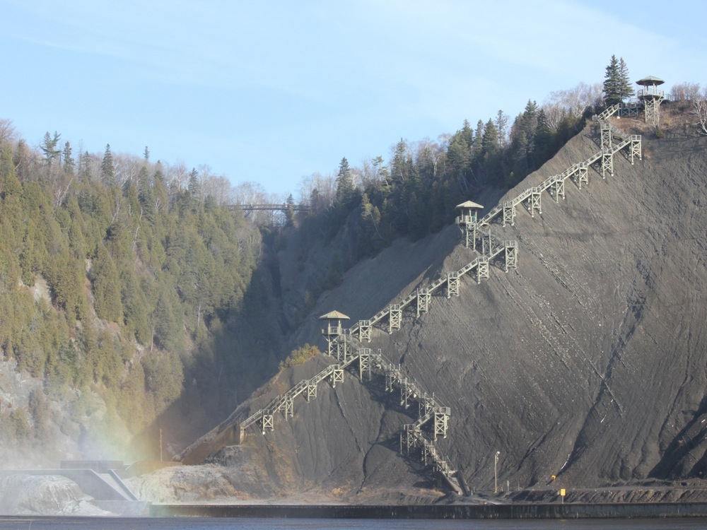 I visited the falls in mid November. On the plus side, it was free. Normally there is an admission fee. Also, there was nobody else there. On the minus side, the trail to the viewing platform and stairs on the left side of the falls were closed. Another minus was that the nearby Saint Anne Falls, and Sept Chutes were also closed.