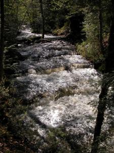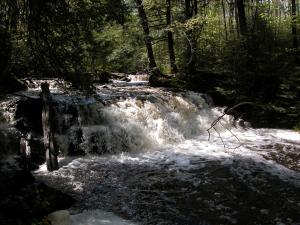 Mosquito Falls is a small waterfall consisting of two main drops about 100 meters apart with a stretch of rapids in between them. The lower drop is about 10 feet high, and the upper one is about 5 feet high. This is the smallest of the named Pictured Rocks waterfalls but it is a very lovely hike, especially in spring when the flowers are out.