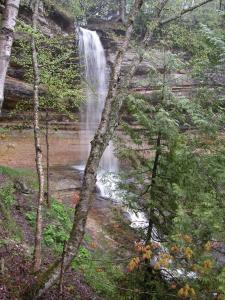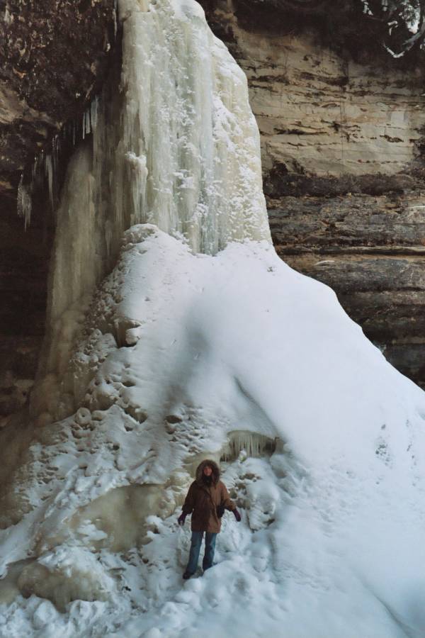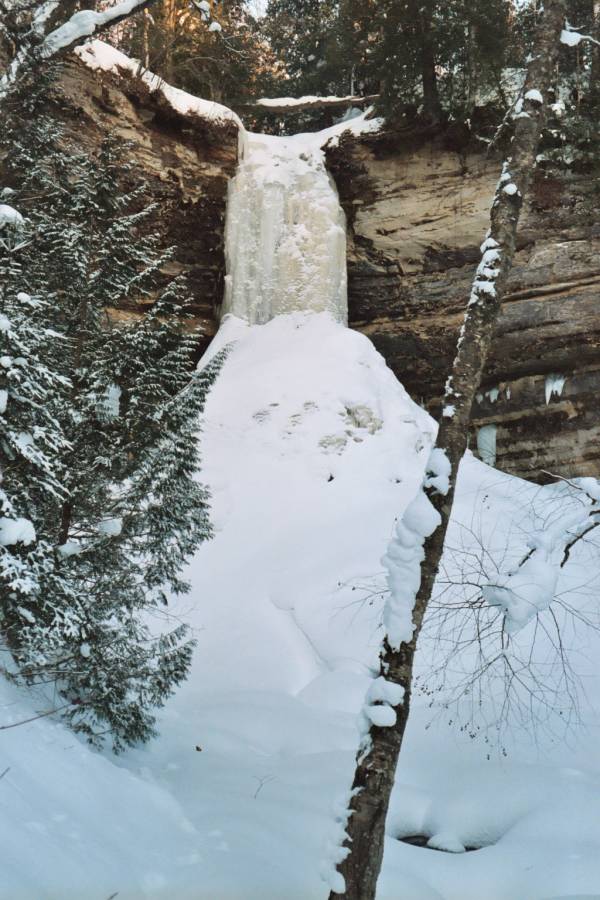 In winter Munising Falls freezes, forming an ice column. It is off limit to climbers, but there are ice curtains and other waterfalls in the area that freeze over in the winter. Munising is a very popular destination among the ice climbing crowd. The ice formations are very interesting even if you do not climb them.