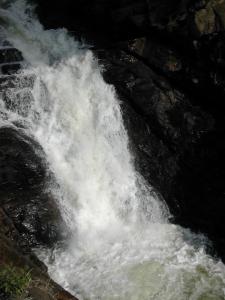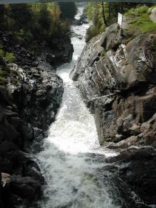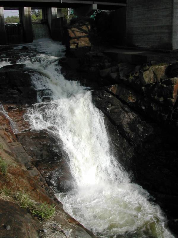 There are no established viewing areas for this waterfall. The easiest vantage point from which to view the falls is under the Highway 11 bridge, which can be accessed from Morrow Drive. Morrow Drive also crosses a bridge above the falls. From here you can walk out under the Hwy 11 bridge and look into the deep gorge. Morrow Drive can be reached from exit 182 on Hwy 11. You probably can canoe up the the base of the gorge. I do not know if there is any other easy land access.