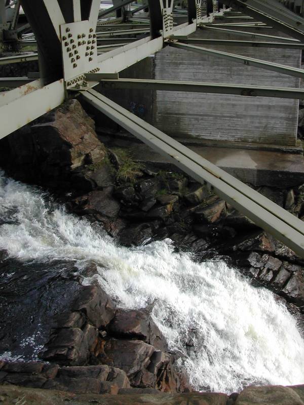 Muskoka Falls must have been a spectacular waterfall once upon a time. The river tumbles down a steep narrow chute cut into the Canadian Shield. But in 1906 a power station (and presumably the first dam) was built at the crest of the falls, and years later the bridge carrying later Highway 11 was built over top of it. Despite all that, it is still worth a visit in the spring. In drier seasons all the water is diverted from the falls.