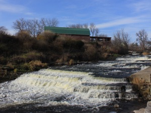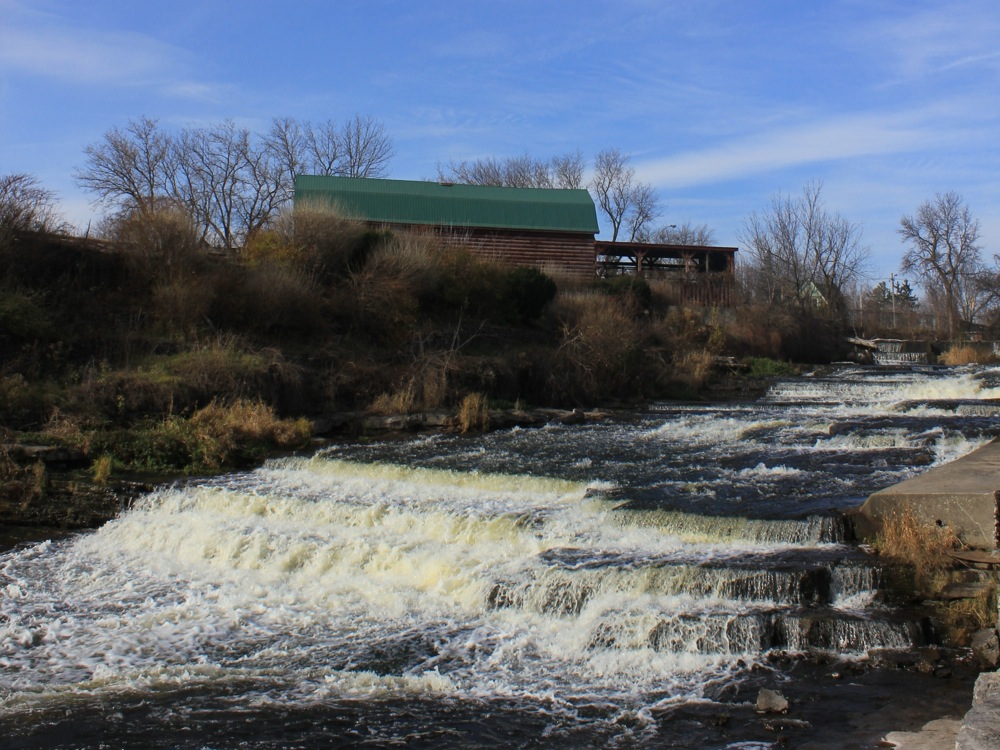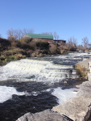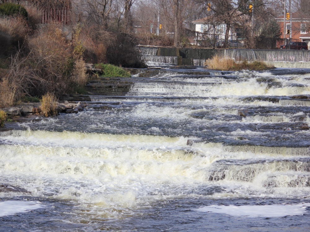 Napanee Falls is a long, low cascade located in the town of Greater Napanee. The river drops 6 meters or so over the course of 20 meters. The falls is located in Spring Side Park. A paved trail runs along side the falls.