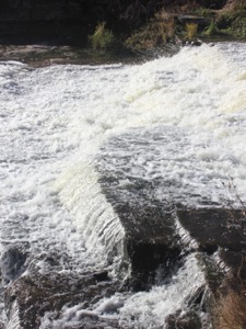 This waterfall was used to power a mill in the 1800s. There is still a small dam at the top of the falls, and the rivers edge is walled.