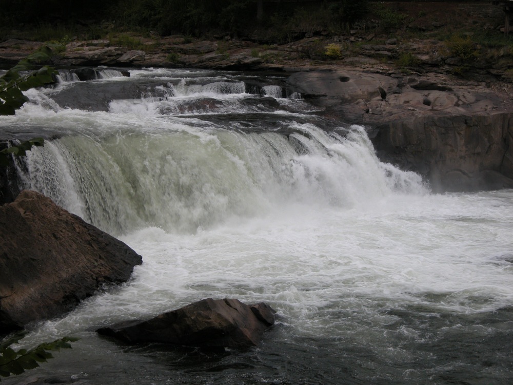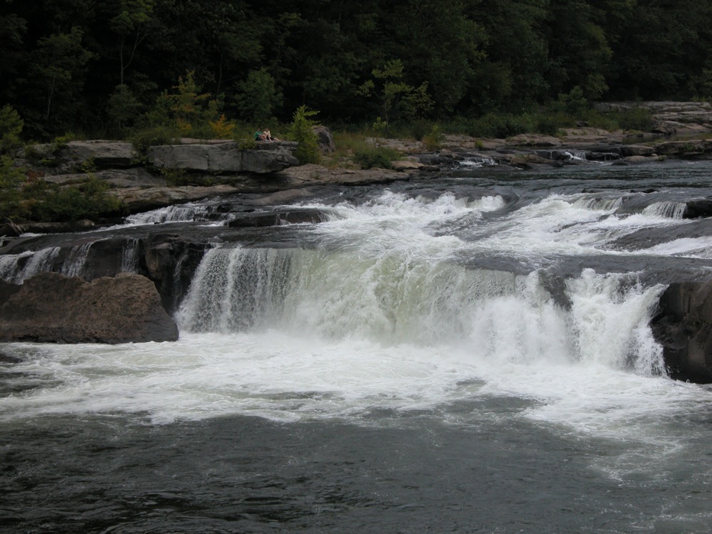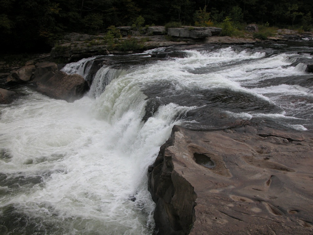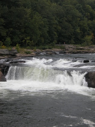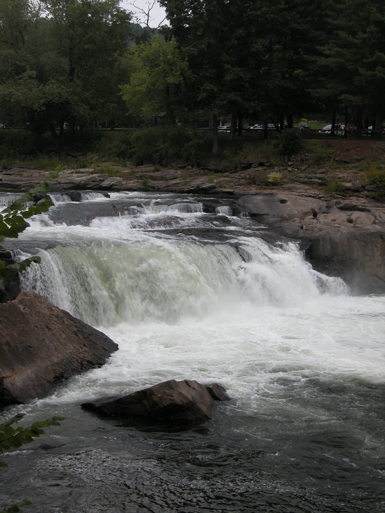Ohiopyle Falls is in Ohiopyle State Park. This is a large park, but the falls are right in the center of it and hard to miss. This is low, wide waterfall on the powerful Youghiogheny River (known as the "Yawk").