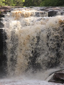 The trail head to the falls is located on the east side of US 45 about 8 miles north of Bruce Crossing. There are signs for the parking area. The trail to the falls is part of the North Country Trail. It is a 1.3 mile fairly level hike to the falls. Before you reach the main falls you will reach a smaller 10' plunge upstream. Keep going! The first time I tried to visit O Kun de Kun I stopped at the upper falls, thinking I had reached my destination. The real falls is just a short distance downstream. The trail crosses a suspsension bridge below the falls. If you have not gone far enough to see the bridge, keep going.