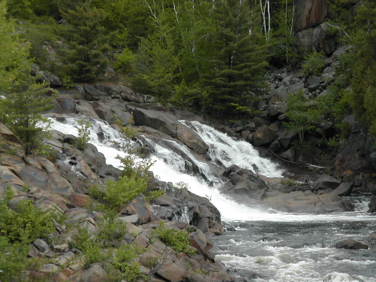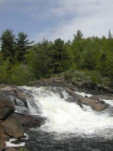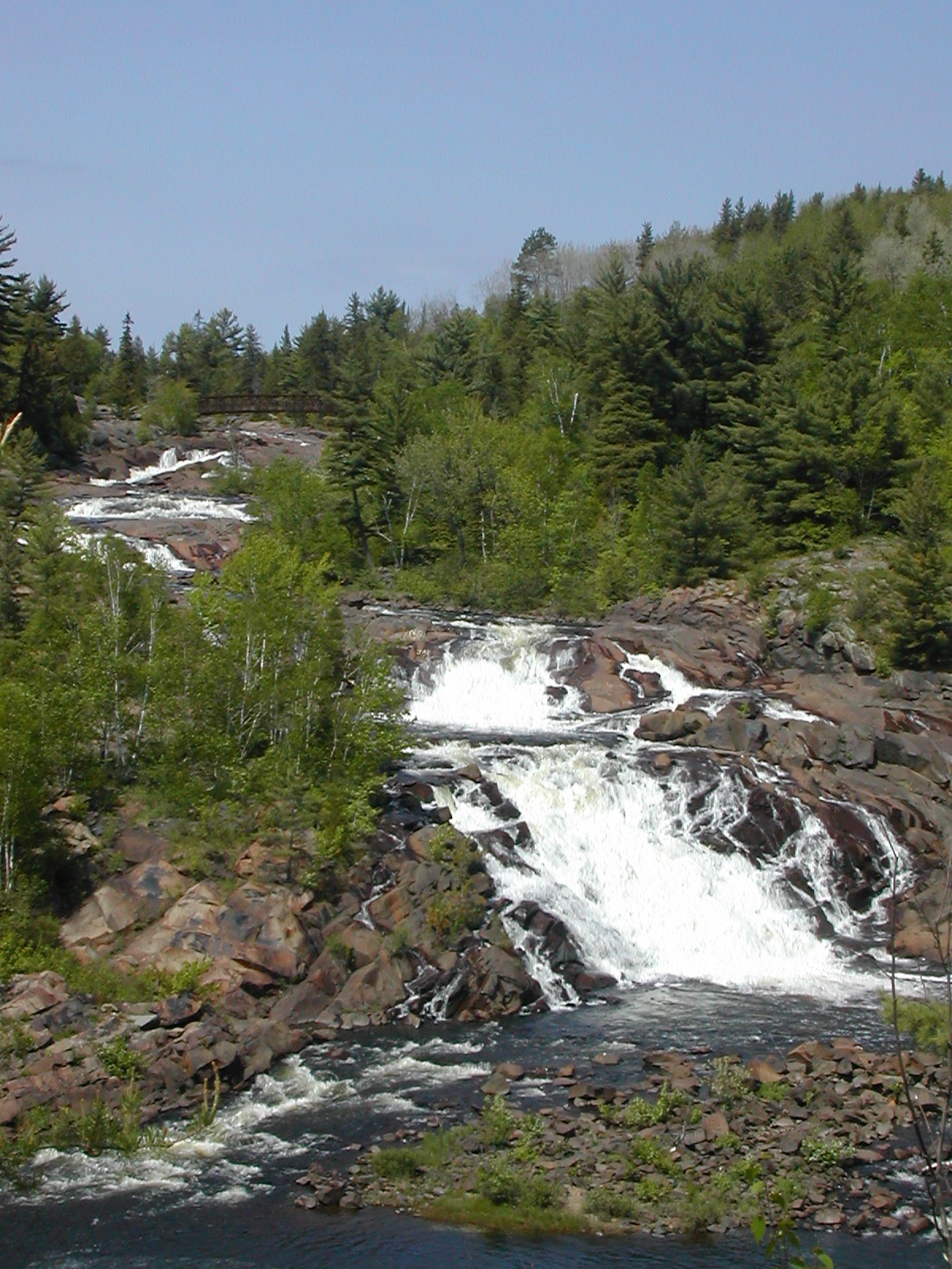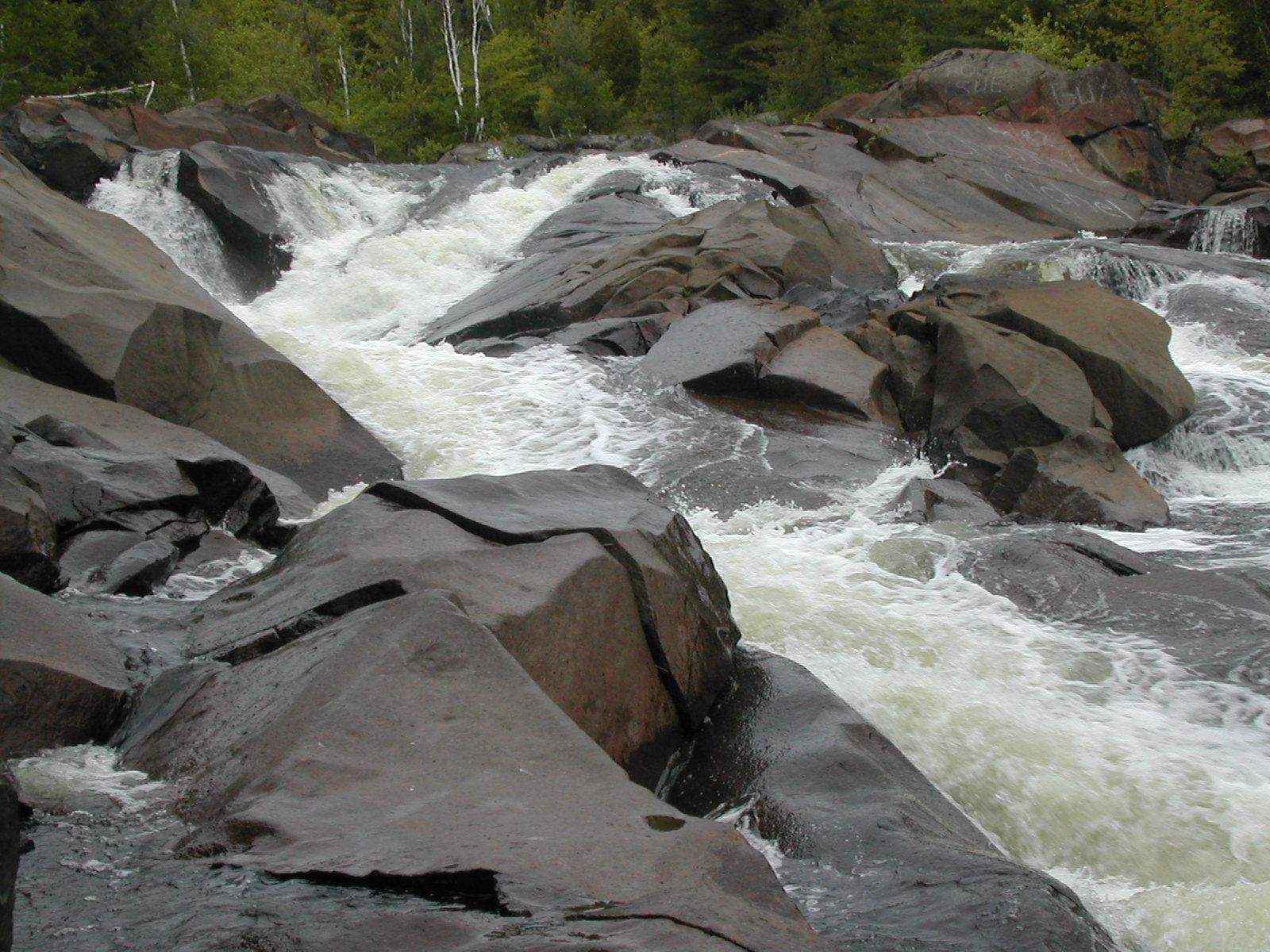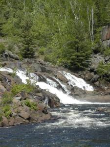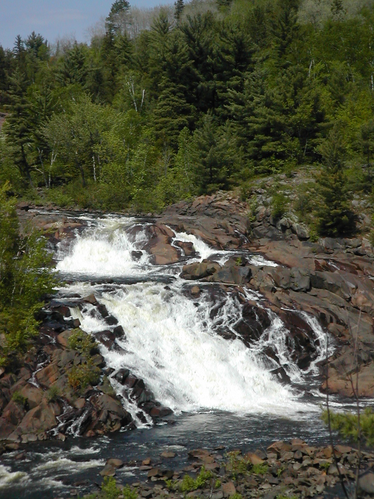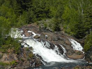 The Onaping River drops over 150 feet here in a series of drops, the largest of which is the 30 or so foot final drop. Each of the individual drops is interesting and many would qualify as named waterfalls all by themselves elsewhere. A trail climbs up across the rock alongside the falls allowing you plenty of opportunities and vantage points to view different parts of the falls. It also provides the locals with easy opportunities to write graffiti on the rocks.