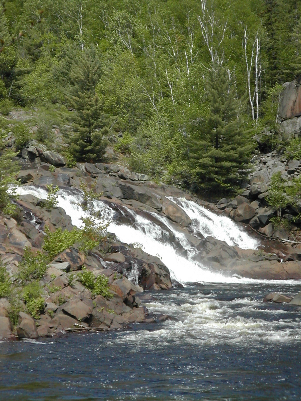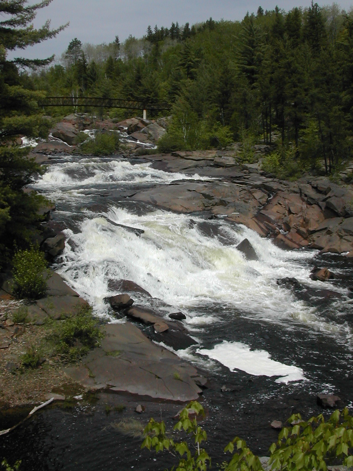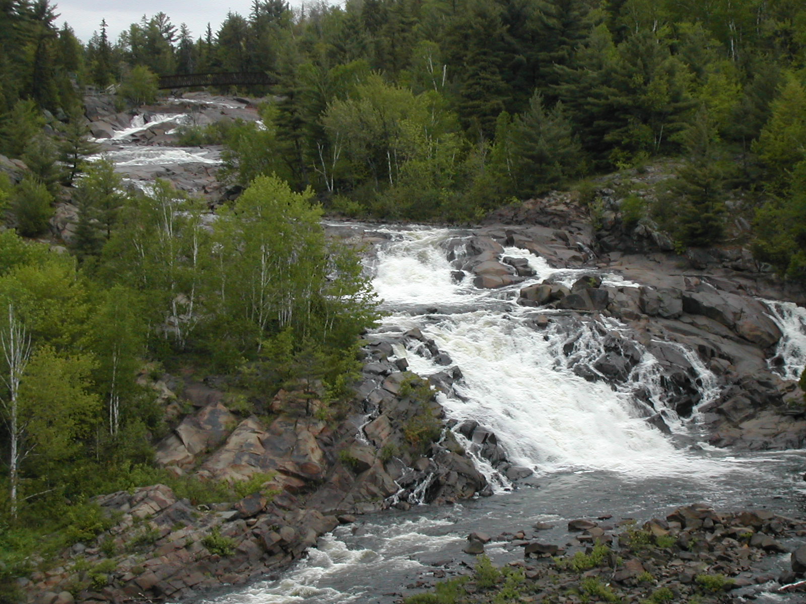The Onaping River drops over 150 feet here in a series of drops, the largest of which is the 30 or so foot final drop. Each of the individual drops is interesting and many would qualify as named waterfalls all by themselves elsewhere. A trail climbs up across the rock alongside the falls allowing you plenty of opportunities and vantage points to view different parts of the falls. It also provides the locals with easy opportunities to write graffiti on the rocks.