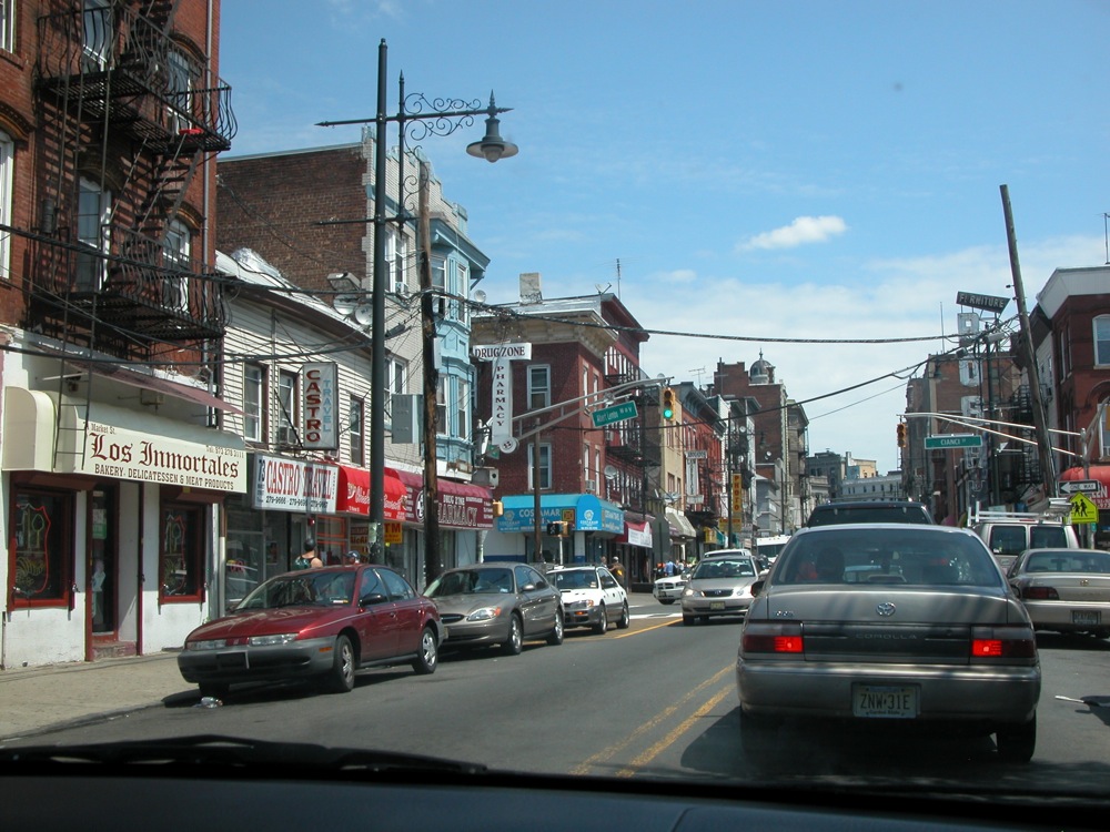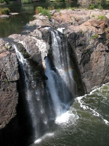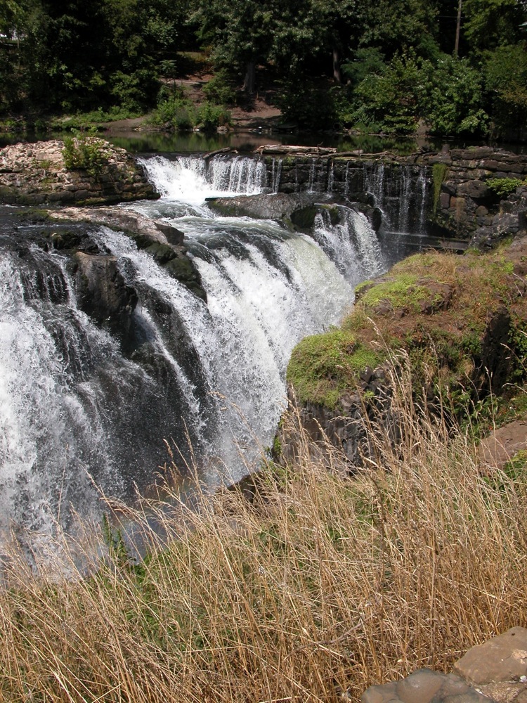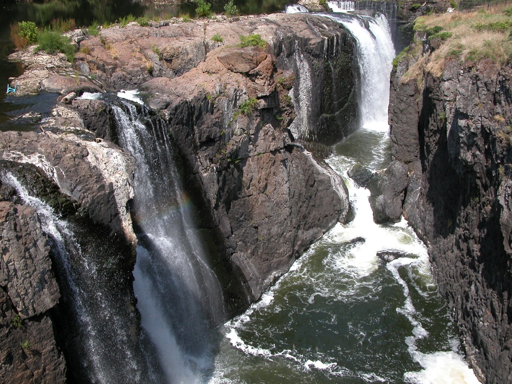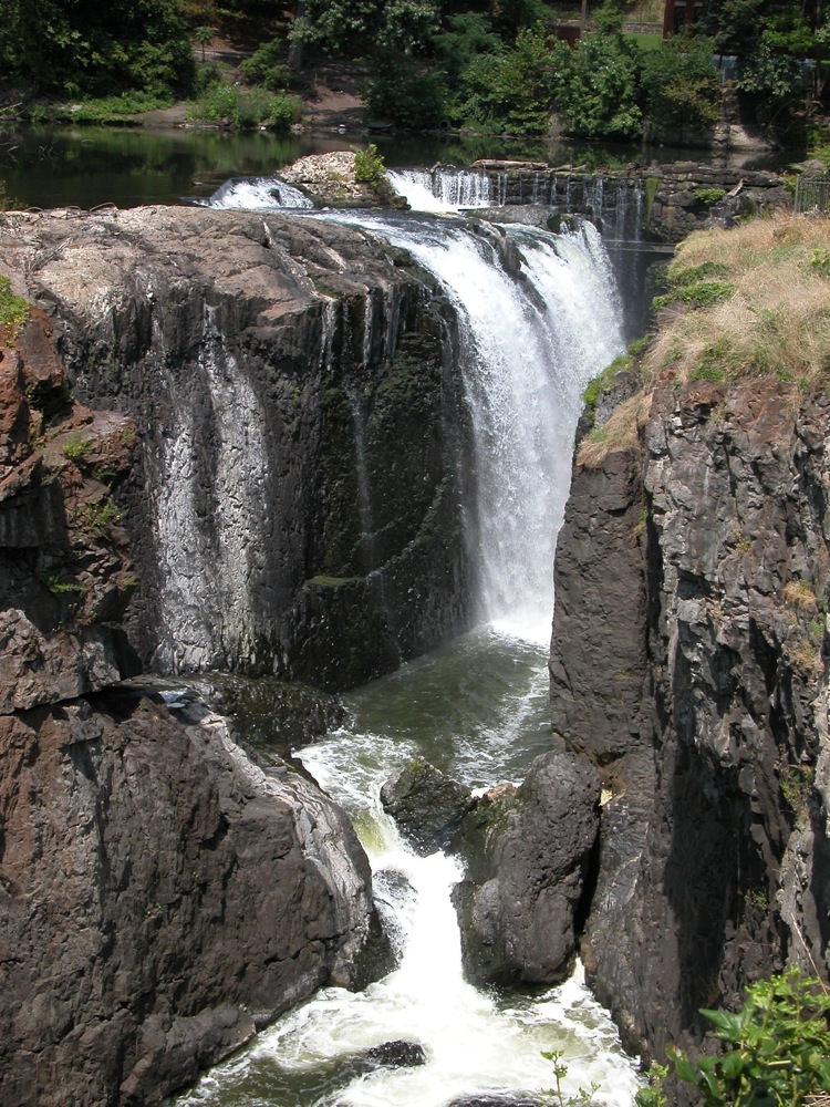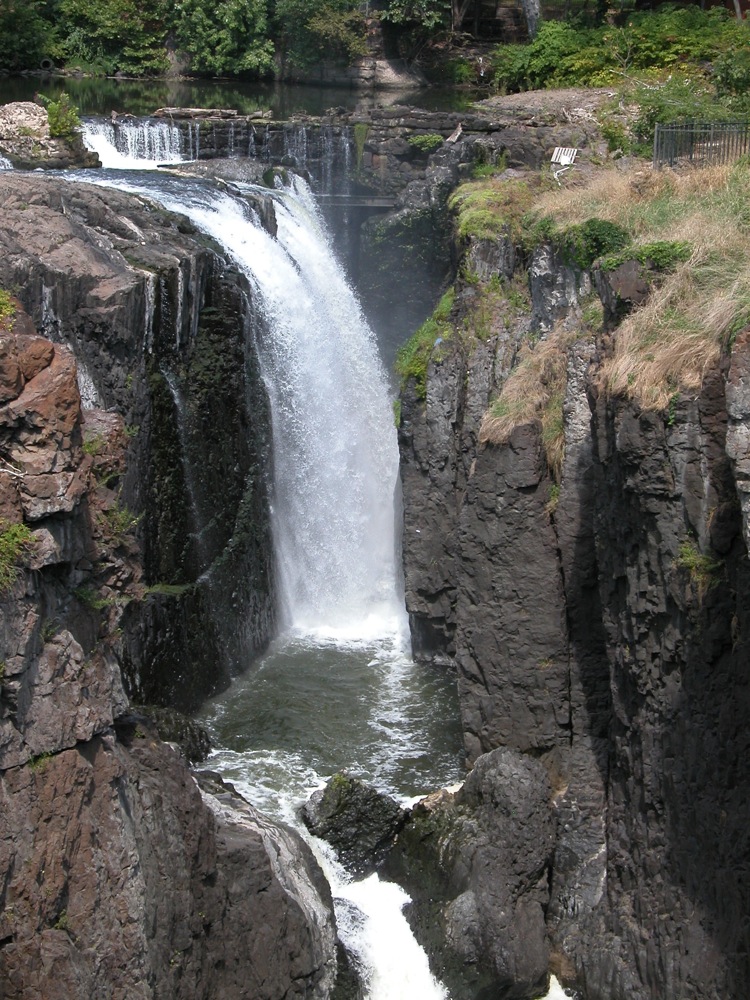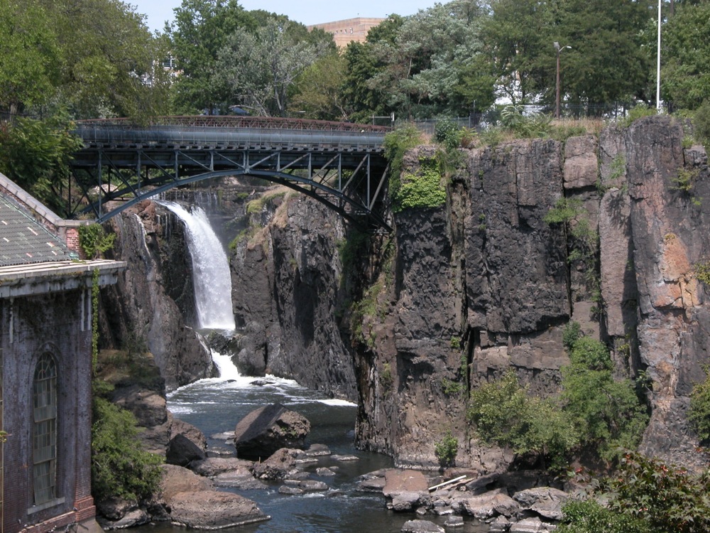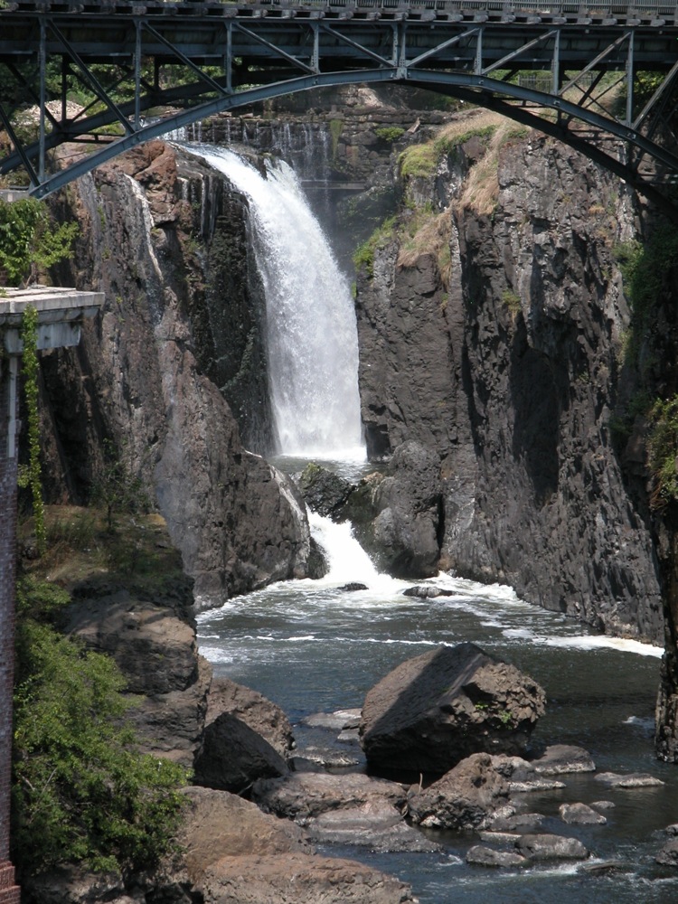 The Great Falls of the Passaic is located in Paterson New Jersey. Here the Passaic River spills into a fissure. This is an urban waterfall. You have to drive through some crowded city streets to get to it. It is also a working waterfall. A small dam is located above the falls, and some of the water is diverted for power generation. Two bridges span the gorge. One carries water pipes, and the other is a pedestrian bridge.