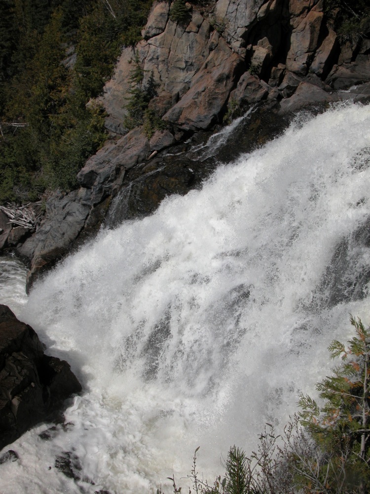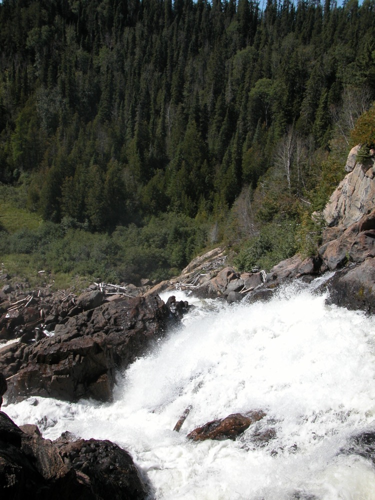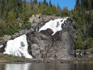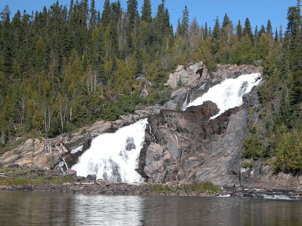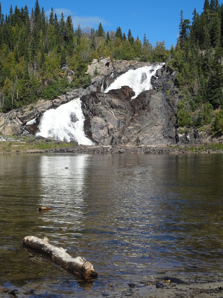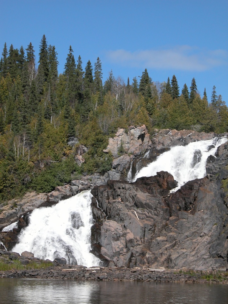 High Falls is a large, wild and scenic falls on the Pic River. The falls is located northwest of Manitouwadge Ontario. The Pic river cascades 30m down a steep rocky escarpment. There are two main drops, each of about the same height. When the water is high there are two lower drops. When I was there the water was all flowing to the right, but if you look carefully at the photos above and below you can see where the left channel would be.
