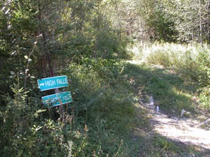 Reaching the falls is a bit of an adventure. From Manitouwadge, you first need to drive about 60km drive on the rough Industrial Road. This is a wide, crushed gravel road, which has many hills and rough spots, and sees a lot of large truck traffic. On the plus side, the signage for the falls is very good. After 60km you have to leave the main road and get on a rough two track and go an additional 5.4km to the falls. A regular car is not going to make it, and even a truck is only going to cover about 3km. From there on you either have to walk, bike or take an ATV. The trail is a two track, and is easy to follow. Take the first left, and then keep to the left. There is a sign at the first branch directing you towards High Falls. Here is the route I took on Google Maps. It is possible to get there in a regular car if you are careful, but a truck or SUV will make the journey a lot easier.