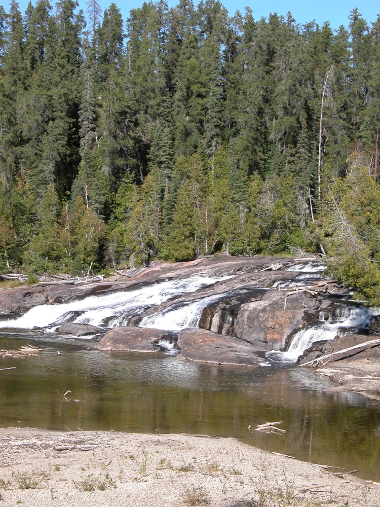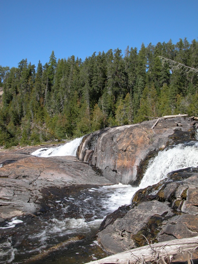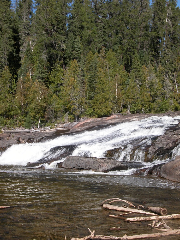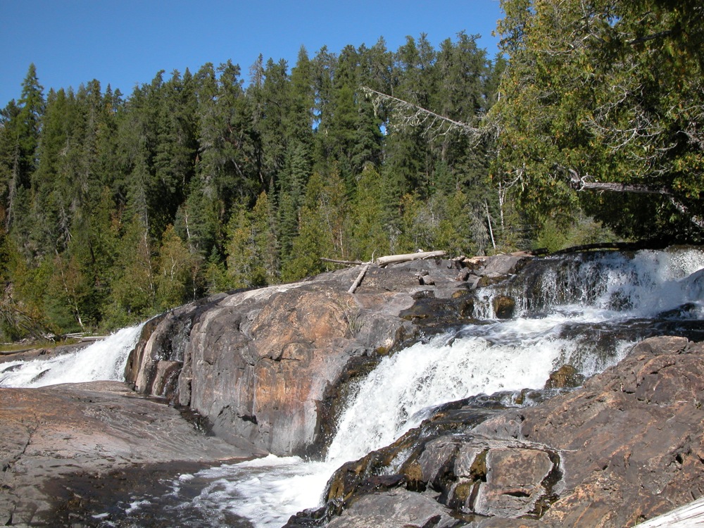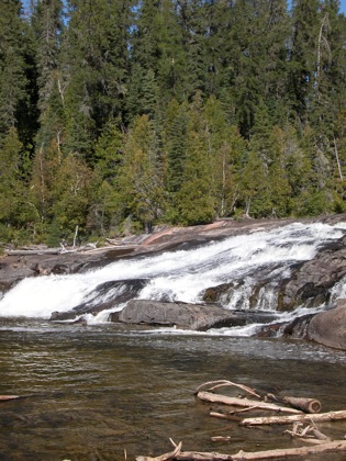 To reach the falls from Manitouwadge, you first need to drive about 60km on the rough Industrial Road. This is a wide, crushed gravel road, which has many hills and rough spots, and sees a lot of large truck traffic. On the plus side, the signage for the falls is very good. After 60km you have to leave the main road and get on a rough two track and go an additional 8km to the falls. A part of this can be covered by a truck, but most of it has to be hiked or biked. Keep following the main trail until it ends. From there follow a foot path to the left down to the falls. This trail is a bit overgrown. Once you get down to the river, just head downstream to the lower drop. You are on your own for reaching the upper drop.