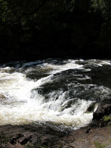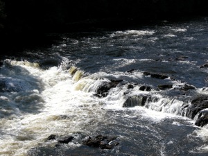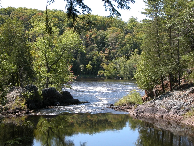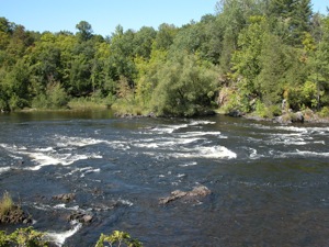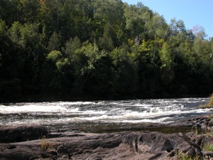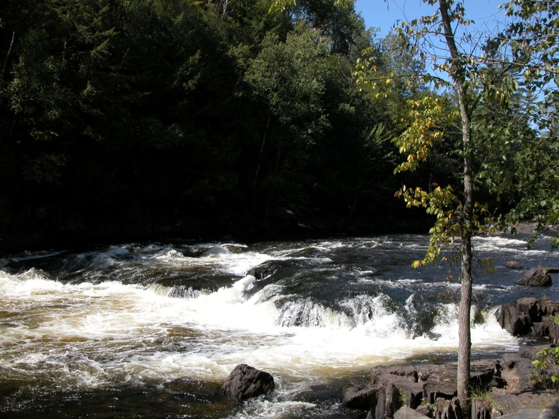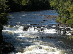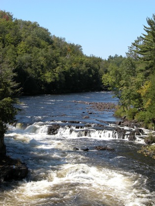 Piers Gorge is a scenic gorge carved out by the Menominee River. It is named for natural rocky "piers" that the river tumbles over, resulting in four sets of rapids, some of which could be classified as low falls. The biggest of the drops is about 8' high and is named Mishicot Falls.