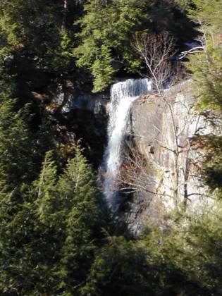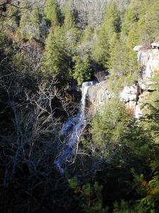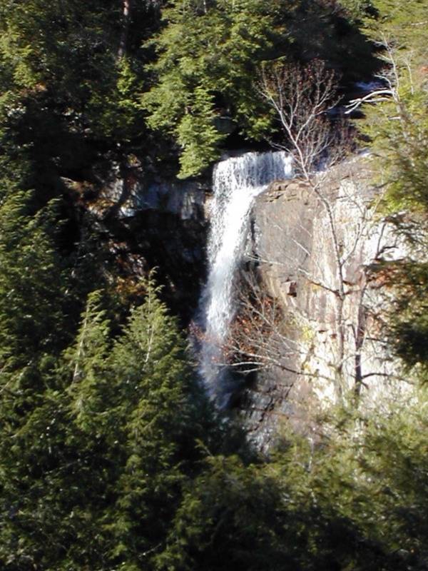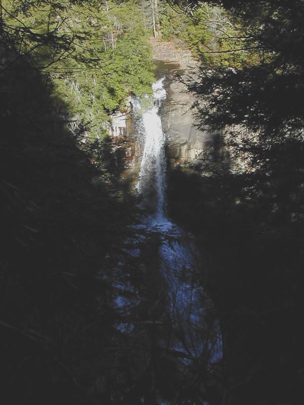 If you really wanted to get a good look at the falls you could walk up the gorge to the base. The hard part is getting down into the gorge. Piney Creek has cut out a deep gorge that rivals Cane Creek's, and the walls are high and steep. At Fall Creek Falls there is a trail that will take you down the the floor of the gorge. Walking down Cane Creek and then up Piney Creek to the base of the falls is about 5 miles one way, and I have no idea how strenuous it would be. They have to occassionally rescue people from the Cane Creek Gorge who underestimate the difficulty. The overnight trail crosses Cane Creek about a mile downstream of the Cane Creek Piney Creek confluence. Just reaching the bridge requires a hike of several miles. If you want to see the base of the falls, you are going to have to work for it. Of course the locals may know some secret way down into the gorge much closer to the falls.