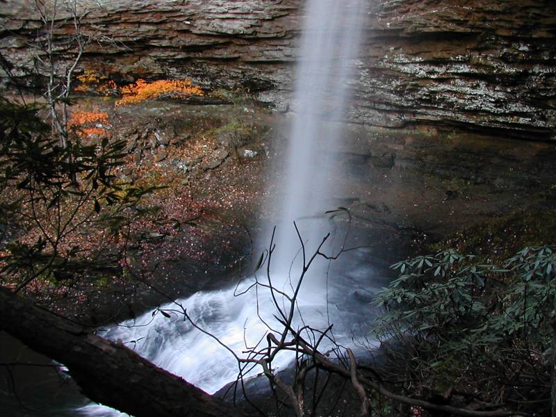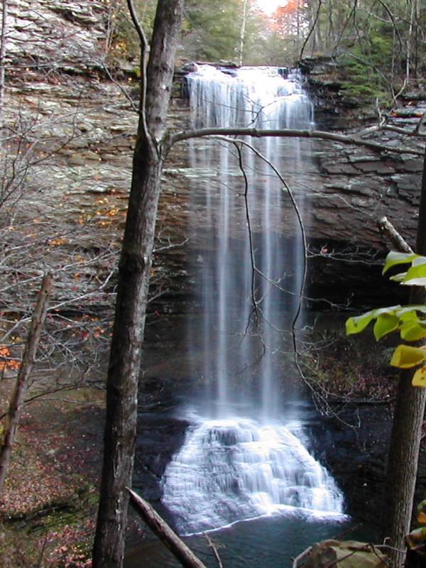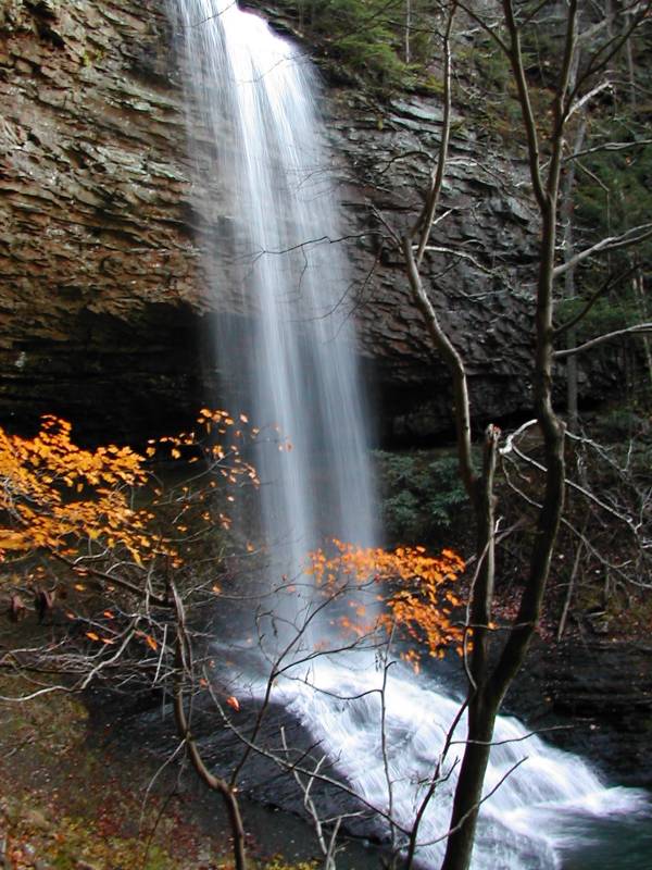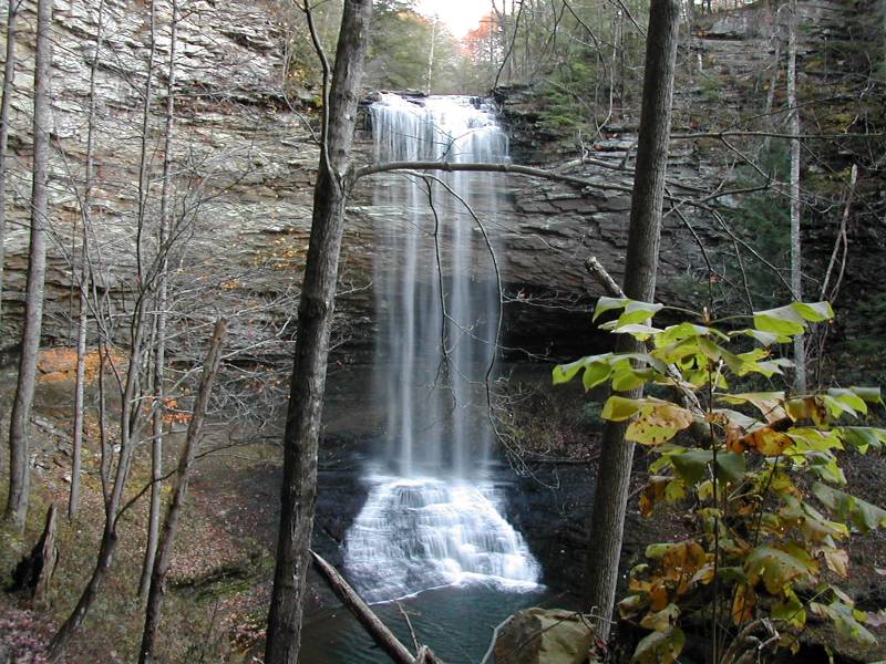 I visited the falls shortly before sunset in the first weekend of November, and the light was a bit dim for pictures. Night comes early in Tennessee in November. There is a lower falls a short distance downstream but it was too dark to visit it, and from what I have read there is no good vantage points from which to view it.