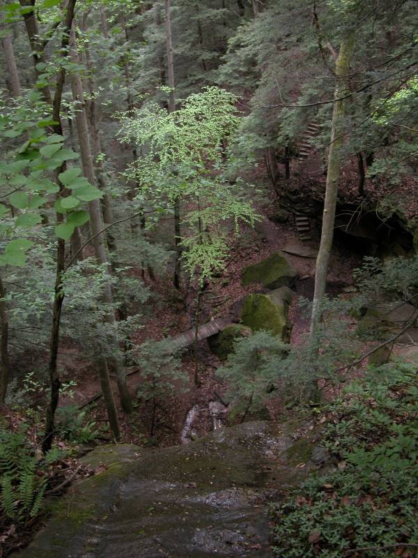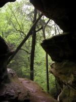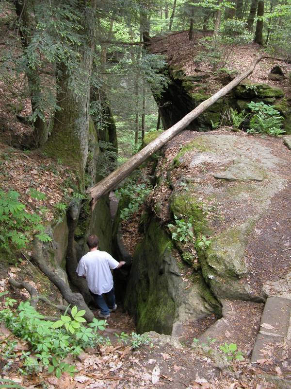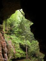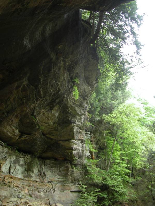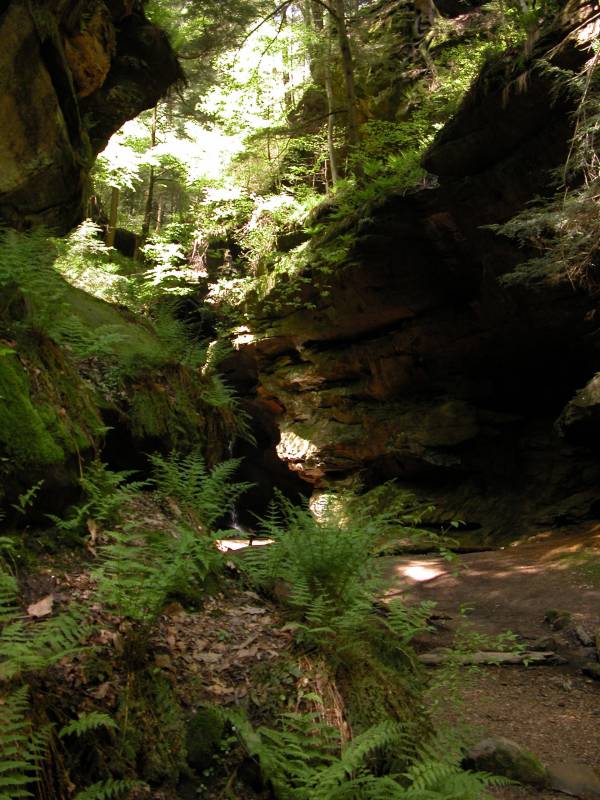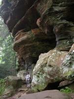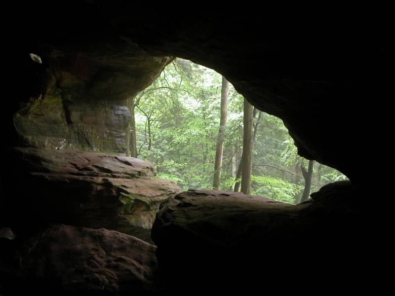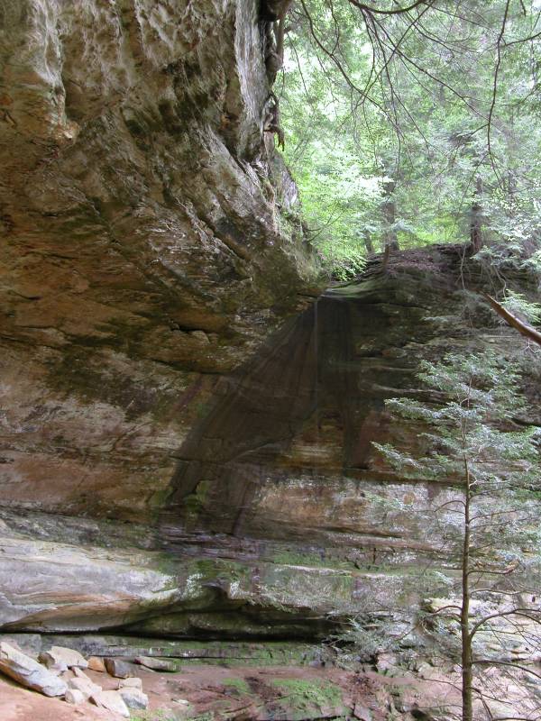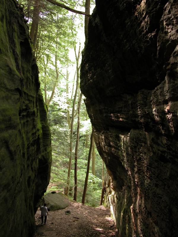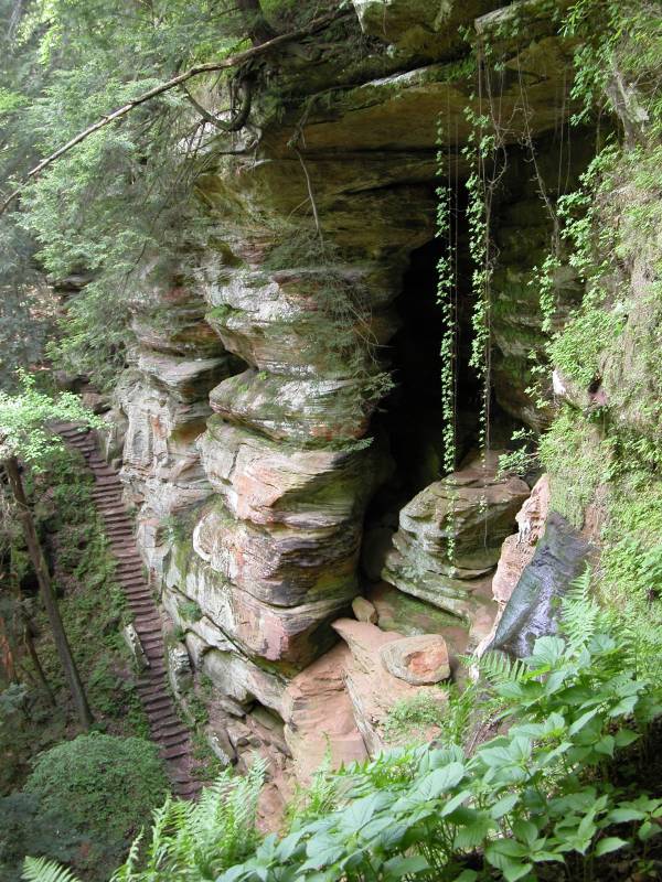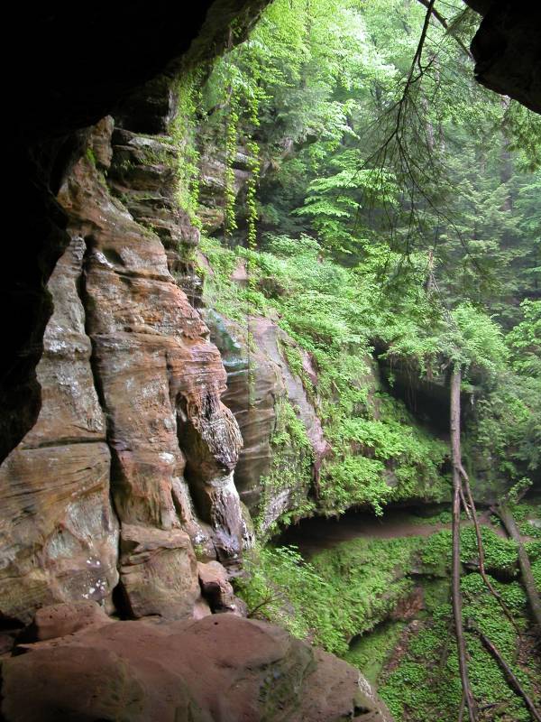 The Rockhouse is a natural tunnel 200 feet long, 30 feet wide, 25 feet high with arched "windows". This is one of the coolest places in all of Ohio. It is easy to imagine that this is an ancient fortress built into the cliffs long ago. In the Spring a temporary waterfall plummets from the 150 foot cliffs. In the Summer vines hang down. Given a choice between living at the Rockhouse or Old Man's Cave, I would choose the Rockhouse.