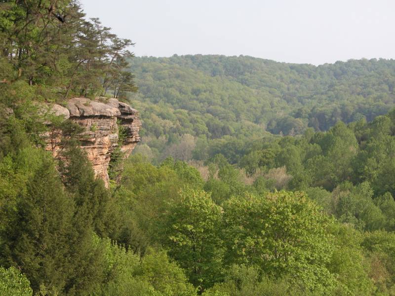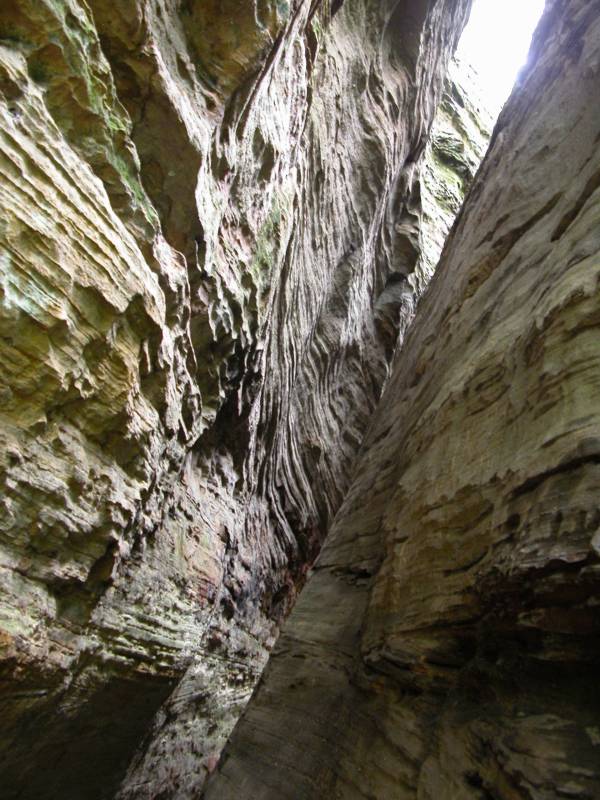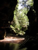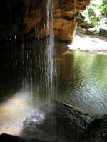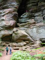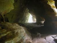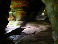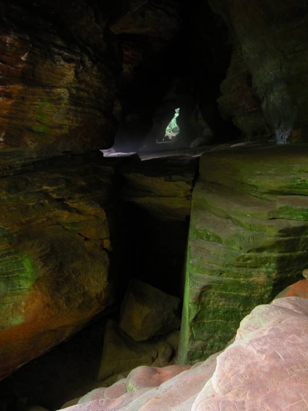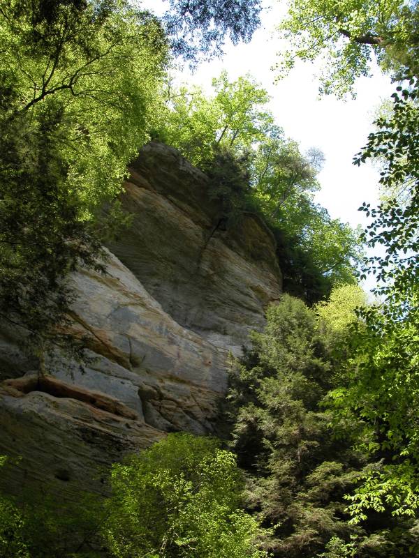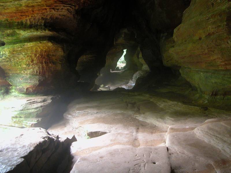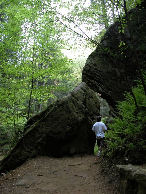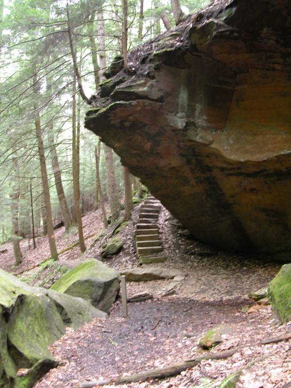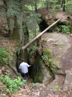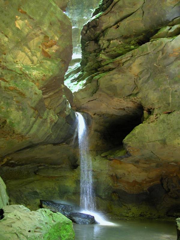 The Rockhouse is a natural tunnel 200 feet long, 30 feet wide, 25 feet high with arched "windows". This is one of the coolest places in all of Ohio. It is easy to imagine that this is an ancient fortress built into the cliffs long ago. In the Spring a temporary waterfall plummets from the 150 foot cliffs. In the Summer vines hang down. Given a choice between living at the Rockhouse or Old Man's Cave, I would choose the Rockhouse.