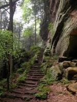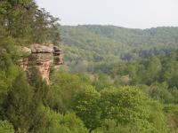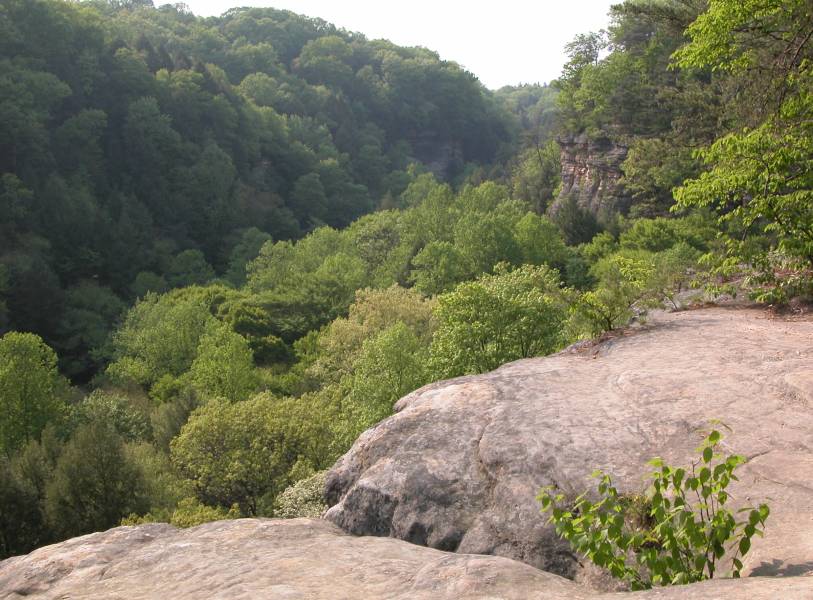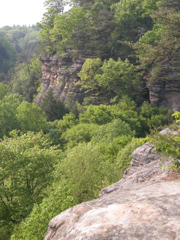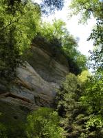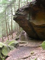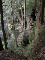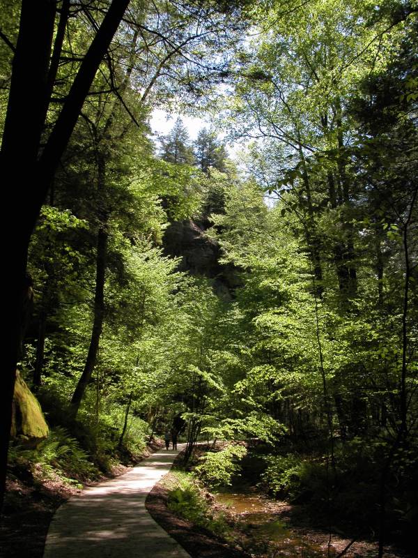 The Hocking Hill's area is full of gorges and valleys called hollows. Conkle's Hollow is over 200 feet deep at places, said to be the deepest hollow in Ohio by some, and is only 100 feet wide at places. The cool microclimate in the gorge supports plants not normally found in Ohio. In Spring several waterfalls can be found in the gorge. The mostly paved gorge trail is 1/2 mile long one way and leads to the main fall which runs later than the others, but dries up in the summer. The much more challenging 2 mile rim loop trail skirts the edge of the hollow. There are many spectacular views and steep drop offs. It also gives you a peek into the inaccessible upper hollow.