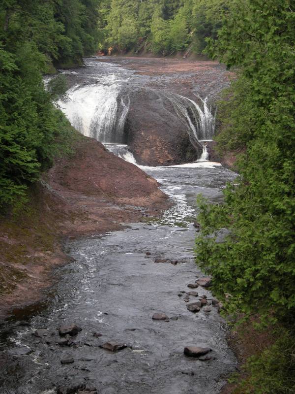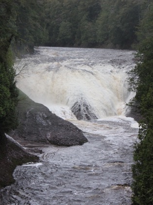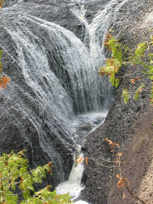 The Black River Scenic Byway starts north of US 2 near Bessemer. There are signs on US 2. Gorge Falls is about 14.5 miles north of US 2. The scenic area is on the right and is clearly marked. The falls are a short walk from the parking area.