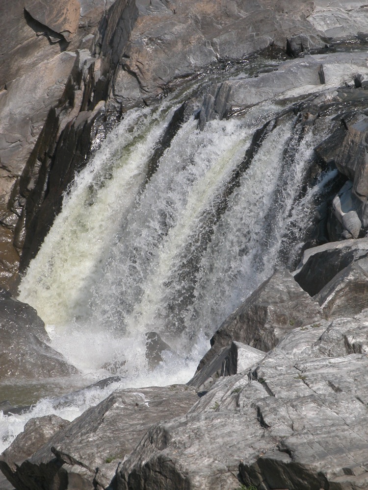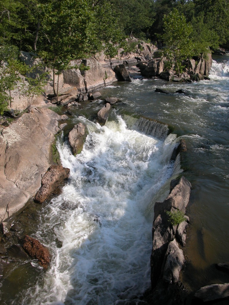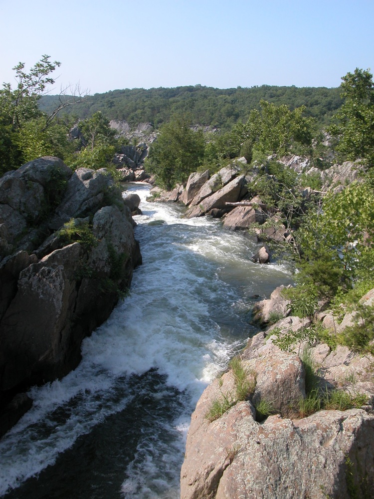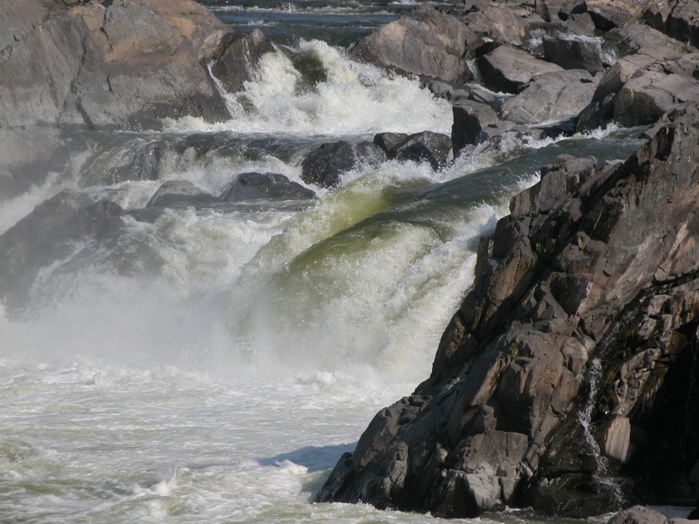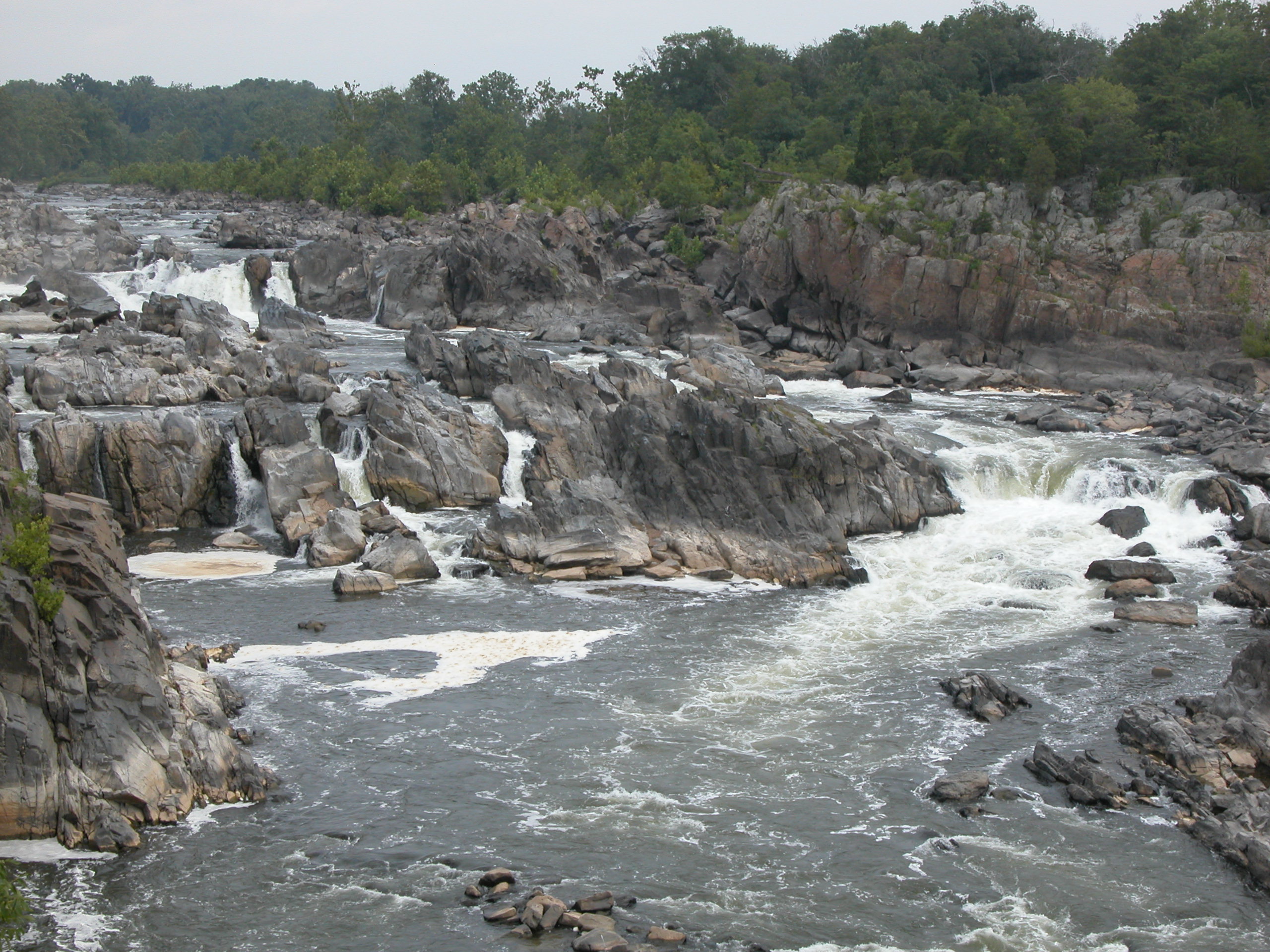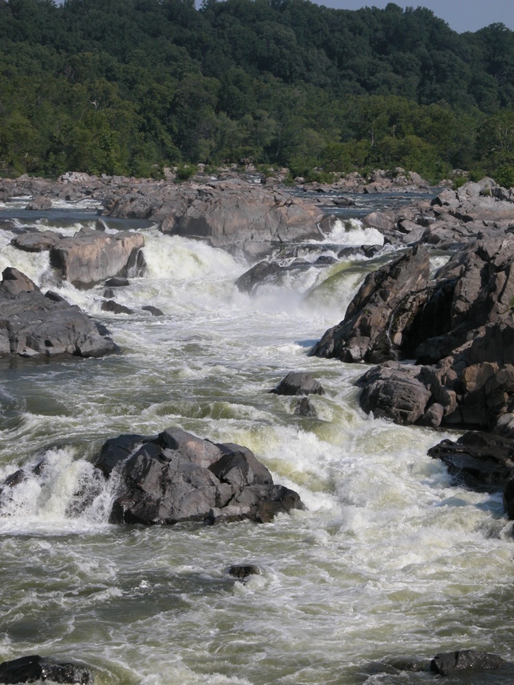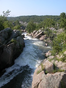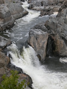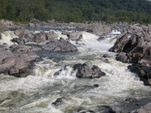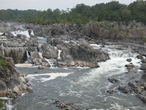 The Great Falls of the Potomac are located at the fall line of the Potomac River. The river drops over 70 feet in less than a mile. There a couple of 20' drops. The number and height of the distinct drops varies greatly with the water levels. During floods the falls becomes one massive boiling rapids. In late summer the rocks dominate the scene. The falls probably looks its best somewhere in between. The pictures on this page show it in early July and during a dry August.