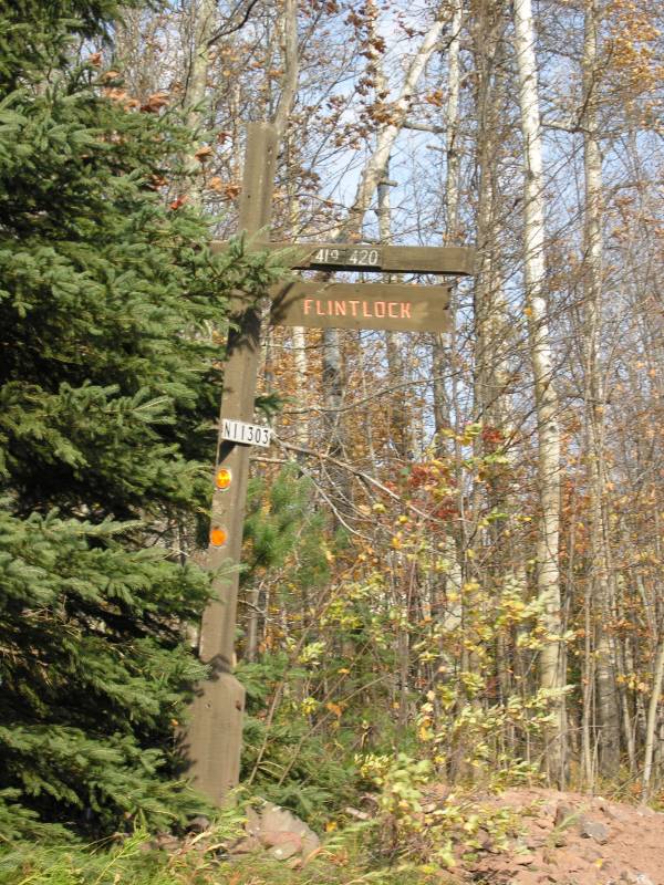 The falls is located off of Powderhorn Road, about 1.5 miles north of US 2. Powderhorn Road is easy to find, thanks to the giant skier on US 2. The road leads to the Big Powderhorn Mountain Ski Area and there is plenty of signage. The falls on the otherhand has no signs. Look for Flintlock Road on the left (the sign is pictured) below. This is a small, rough dirt road. Opposite this on the right side of the road is a trail. The road runs parallel to the creek and the creek is not visible from the road. If you reach the Powdermill Creek Resort or the big curve in the road you have gone too far.
