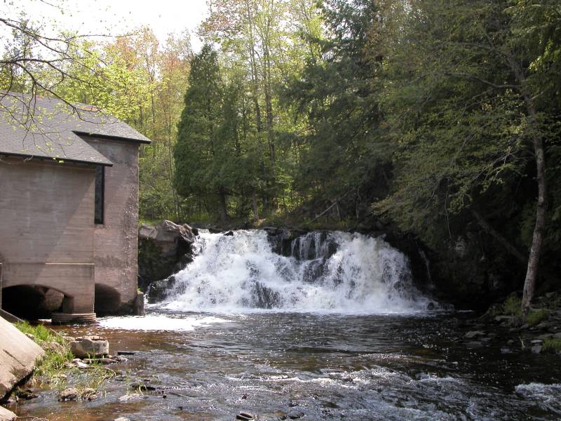 Power House Falls is located on the Falls River. It is the largest of many falls to be found on the aptly named river. The river is about 40 wide here and drops 15 feet. The falls is named for the old power house that stands next to it.