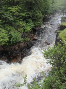 The trail is a third of a mile long. It starts out wide and level, but narrows as it nears the falls. The trail crosses a wooden footbridge over a small rocky gorge. This is actually a minor channel of the Grasse River. The river divides just above the falls, but only a tiny fraction of the river goes through this channel. The trail leads to the gorge just below the falls. You can walk up to the top, or downstream to the end of the gorge. The trail continues downstream a short distance beyond the gorge.