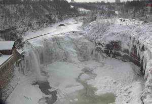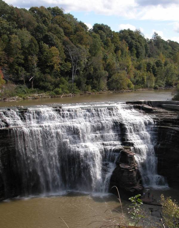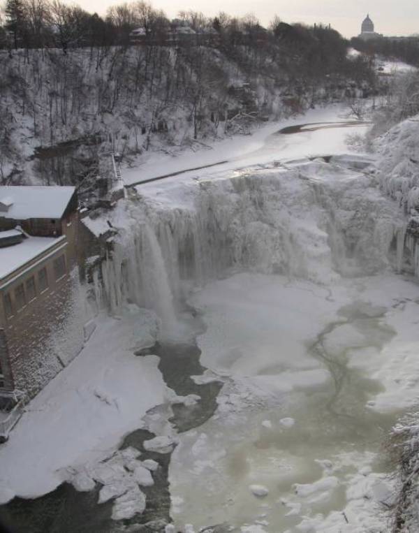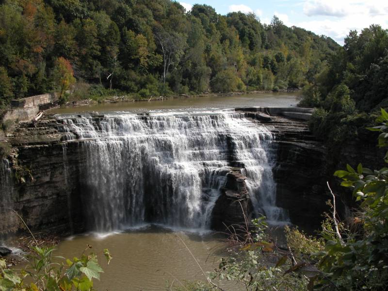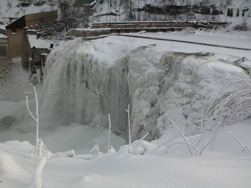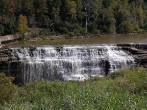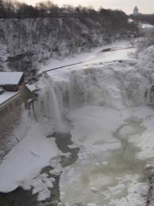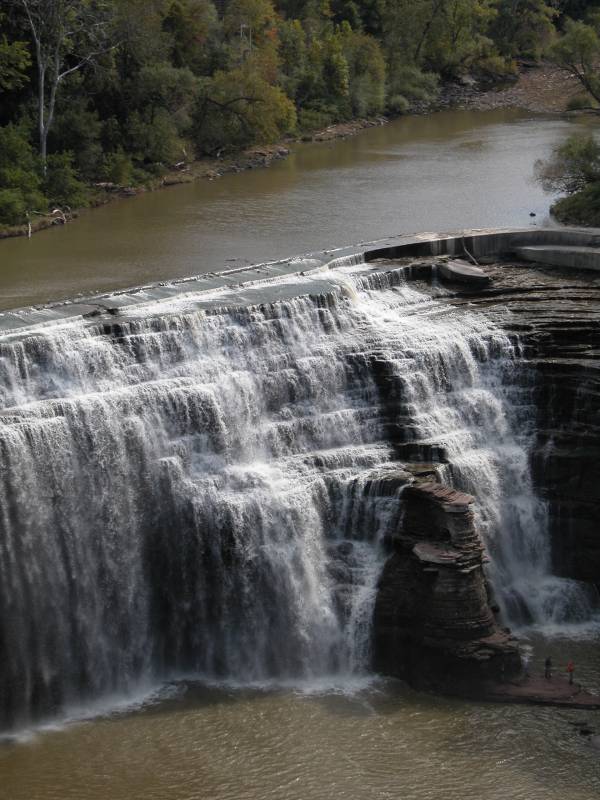 This waterfall is 2 miles downstream of the High Falls. This is the last of many plunges along the Genesee River before it empties into Lake Ontario 6 miles to the north. In my opinion it is very similar in appearance to the Middle Falls in Letchworth.