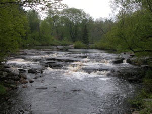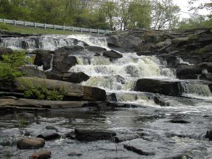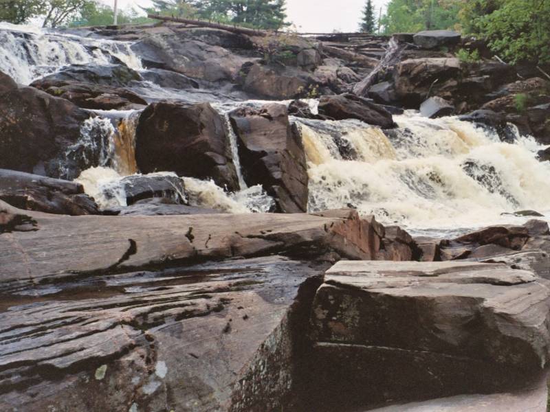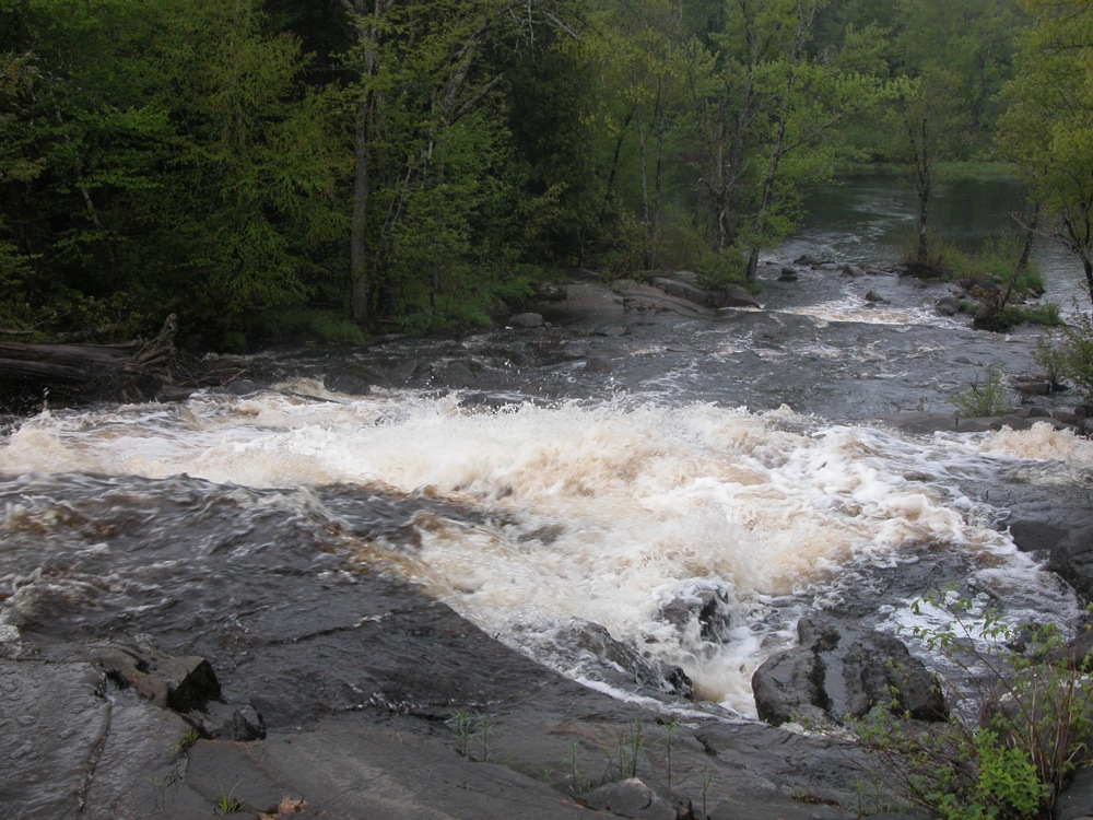 Upper Rosseau Falls is located on Highway 141 about 7 km east of Rosseau. This is much steeper than the lower falls, but not as interesting in my opinion. The falls is on the south side of the highway. There is a small roadside park on the north side. The park consists of little more than a parking area. You can see the top of the falls from the road, and a rapids above the falls.