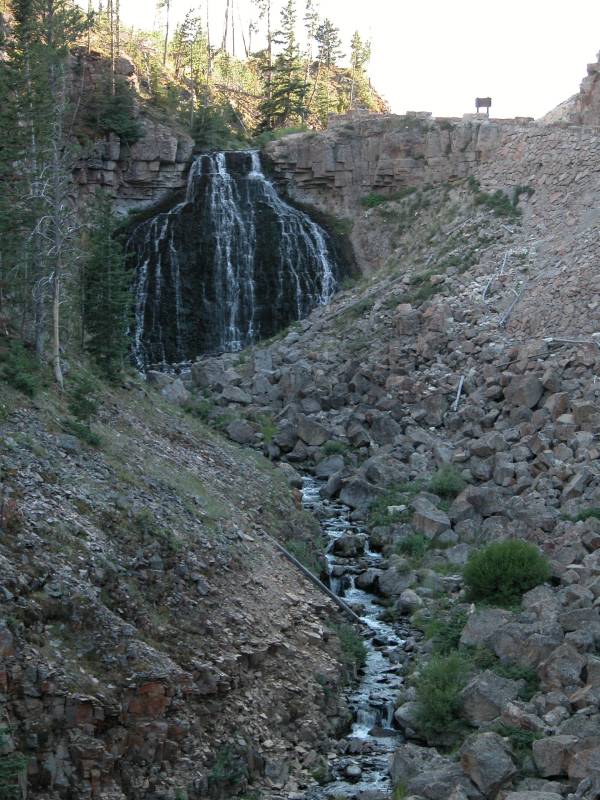 Rustic Falls are in Yellowstone National Park, a few miles south of Mammoth Springs. There is a small parking area alongside the road from which you can get a nice view of the waterfall. This waterfall is best viewed early in the season. By mid July the flow over this fall gets pretty low. This is in spite of the fact that the flow of Glen Creek has been augmented by means of an underground pipe from Indian Creek. I do not know exactly when or why this was done.