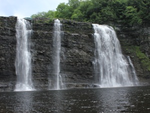 Salmon River Falls is large and very scenic waterfall located in the Salmon River Falls Unique Area. The Salmon River tumbles over a 110' high, 200' wide sheer cliff. The falls is typically divided into three segments, but when the river is very high there may be only two, or a single enormous sheet of water. This is rare, as the river is diverted upstream for power generation. Enough water is left to flow over the falls to make it aesthetically pleasing.