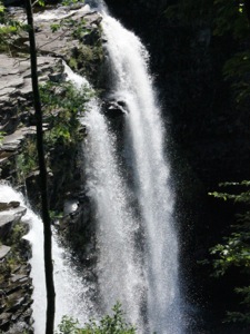 The falls has a large plunge pool, and the steep cliffs prevent you from walking right up to the base. The closest you can get is the small island below the falls. To reach this you have to rock hop and or wade across about 50' of water.