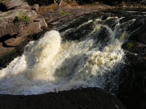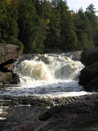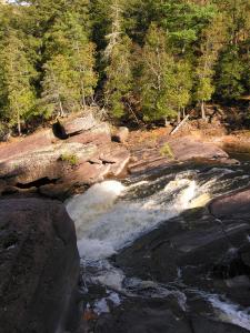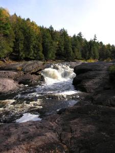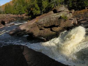 From Sandstone Falls you can hike or drive downstream to see Rainbow Falls, or upstream to see Gorge Falls, Potawatomi Falls and Conglomerate Falls. The minor Algonquin and Chippewa Falls are further upstream. North of Ramsay on the Black River you can find Gabbro Falls. It is an 8 mile hike along the North Country Trail or a 40 mile drive to Manabezho Falls. To the west along the Wisconsin/Michigan border you can find Saxon Falls and Superior Falls.