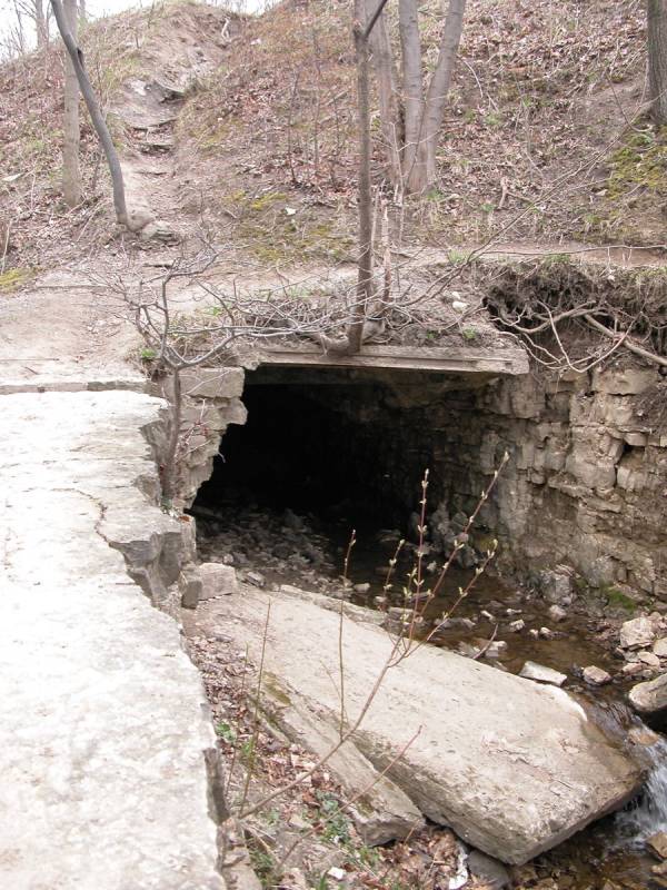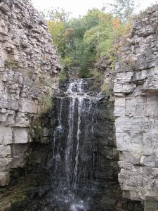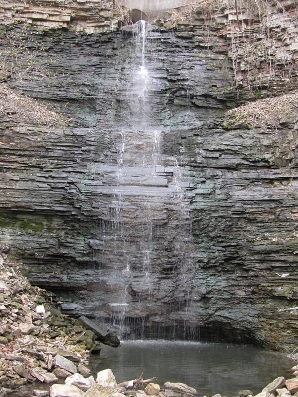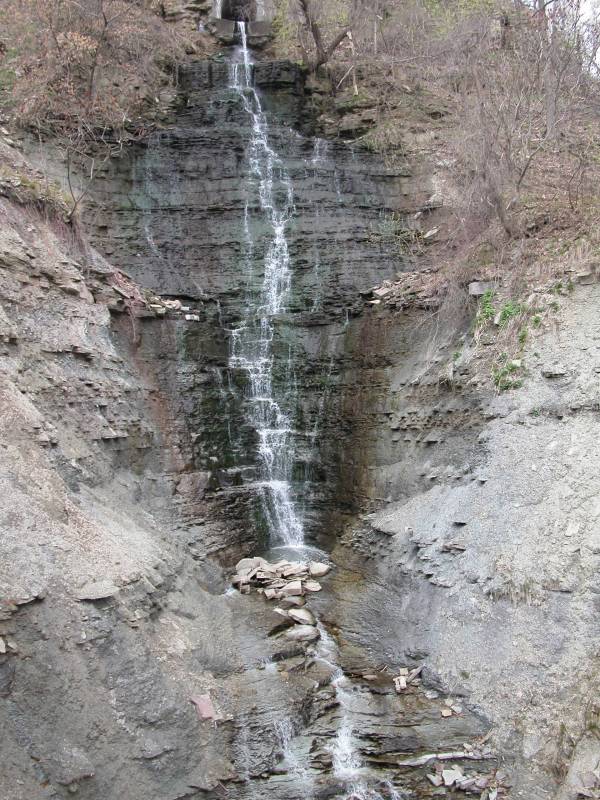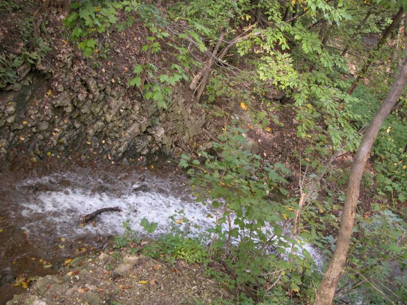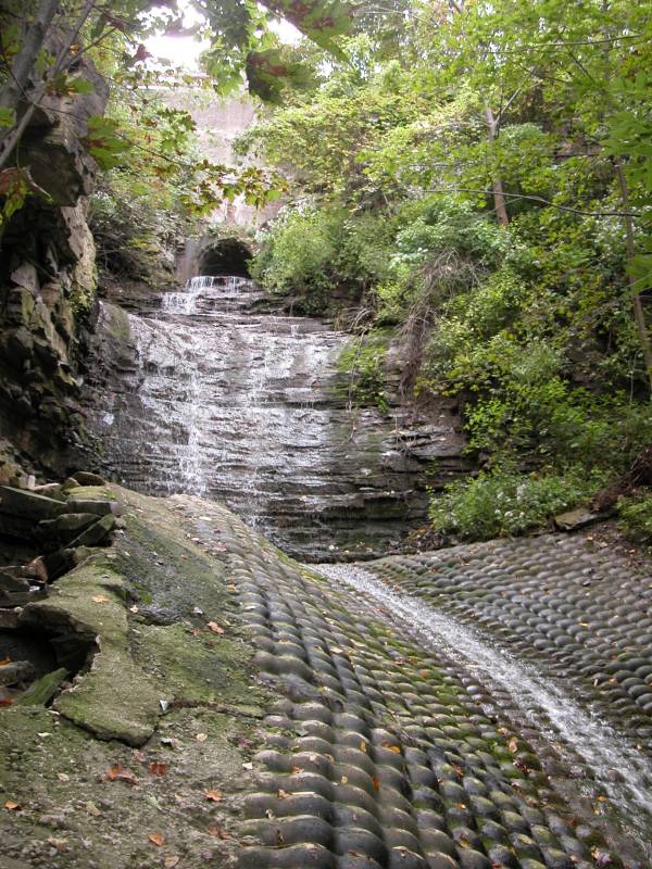 It is not clear how natural this waterfall is. Clearly a creek did cut a gorge here, and there must have been a waterfall, but it is possible the creek has been diverted somewhat and that the current waterfall is not in its natural position. Above the falls the creek flows out of a culvert and then along a straight, but possibly natural channel in the escarpment rock.
