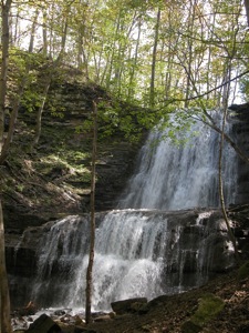 To reach Sherman Falls exit the 403 at the Rousseaux Street exit. Take a right onto Wilson Street, a left onto Montgomery Street, and a right onto Old Dundas Road. You will reach a stop sign where Old Dundas takes a sharp right. The dirt road in front of you is Lions Club Road. Park there. The falls are in the woods to your left. They are just visible from the road through the trees.