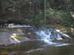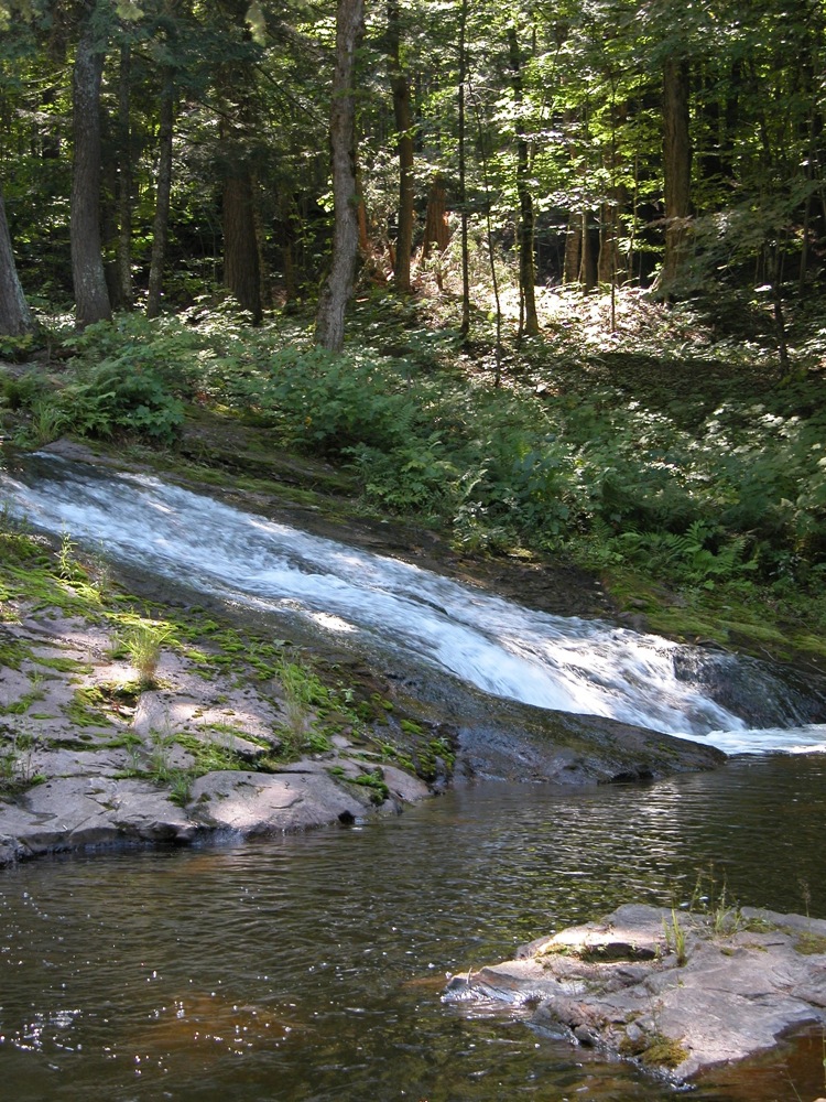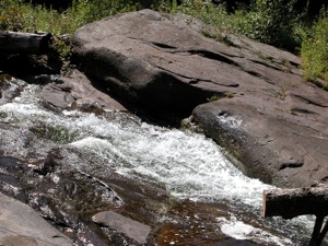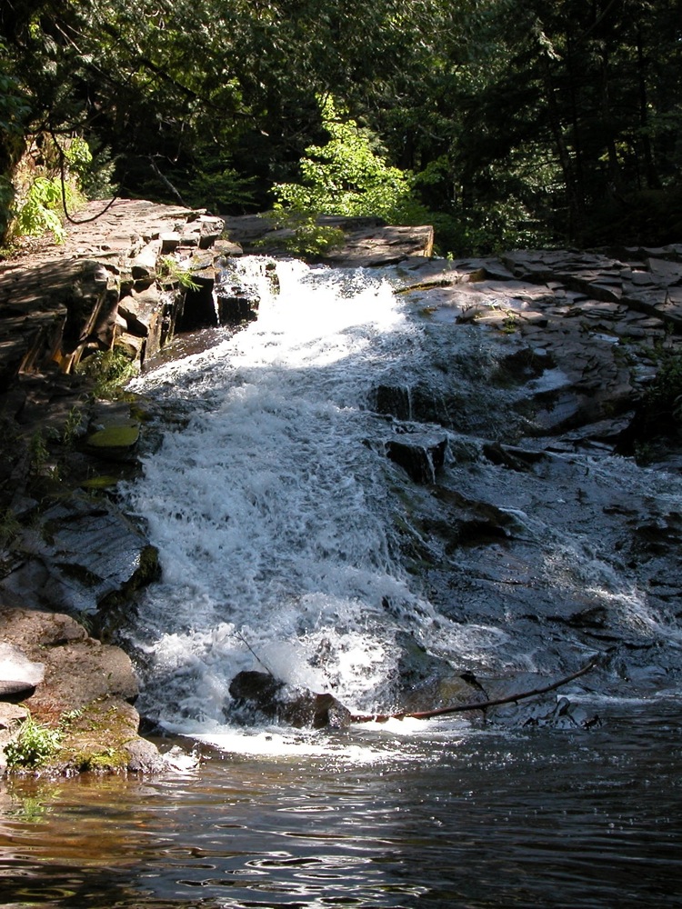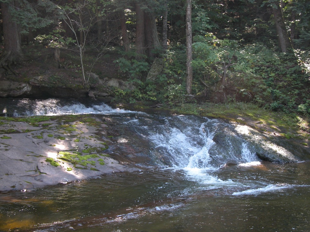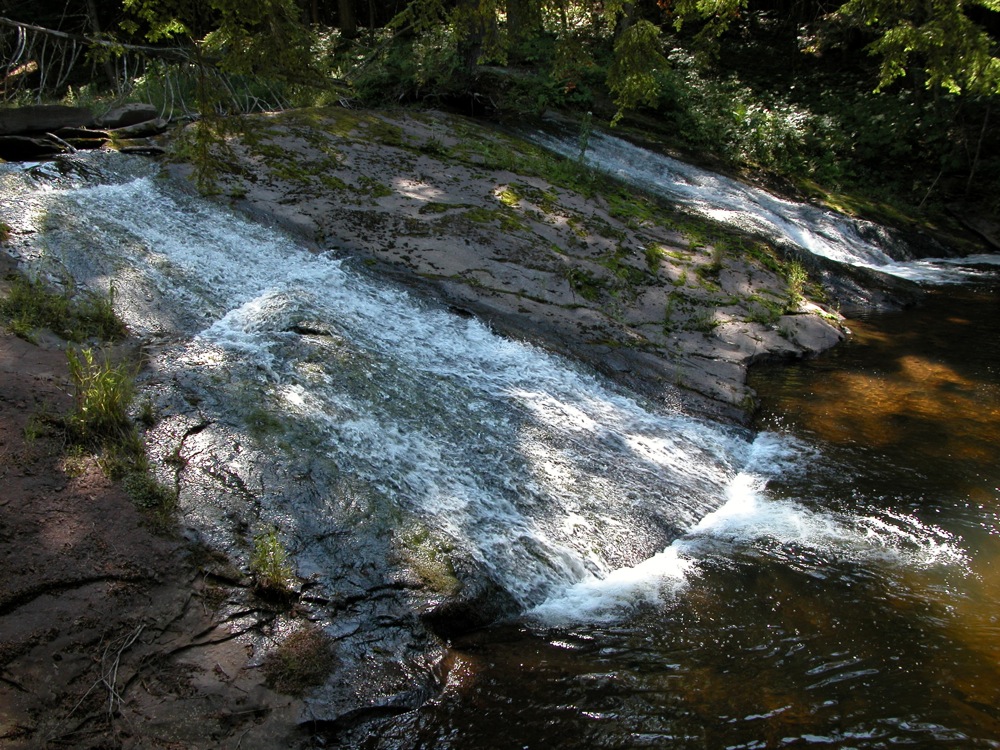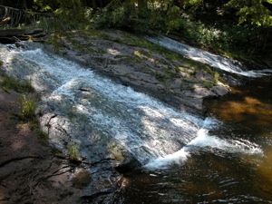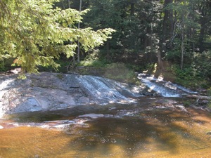Downstream of Shining Cloud Falls are a number of unnamed falls and rapids. Several of these are larger than some of the named falls on the Little Carp River. The last drop near the Lake is known as Bathtub Falls. If you are hiking upstream to the falls, do not be fooled by the smaller drops. The trail follows the river closely, but it climbs away from the river before reaching Shining Cloud Falls. There is no sign marking Shining Cloud Falls, but it is very distinctive.