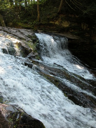 From the trail you cannot see much of Shining Cloud Falls. Just below the falls is a deep and precipitous gorge and the trail passes high above the falls. There is one distant somewhat overgrown overlook on the trail. To get better views you will have to descend into the gorge a bit. Getting to the top of the falls is not too hard, and assuming the water is not really high, you can walk down the side of the slide to reach the base of the falls.
